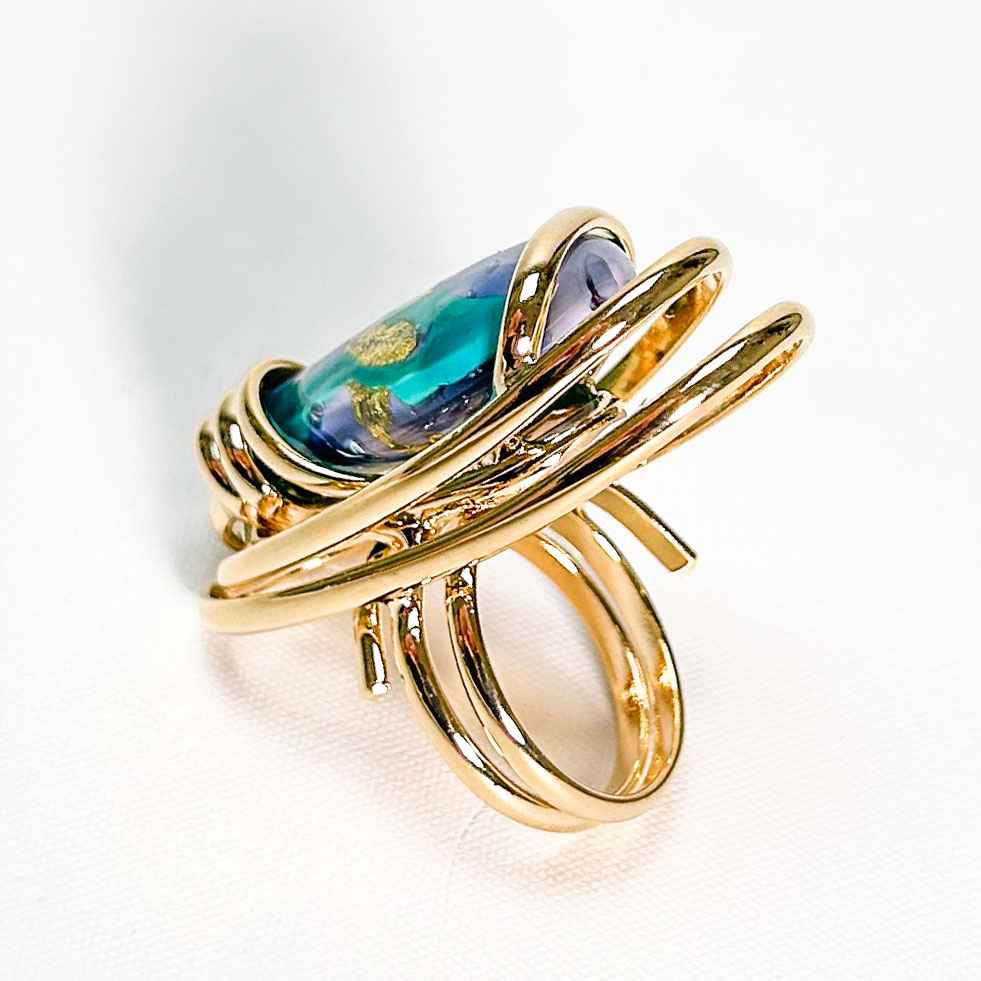 The ring is adjustable in size and features a glass pearl approximately 30 mm long