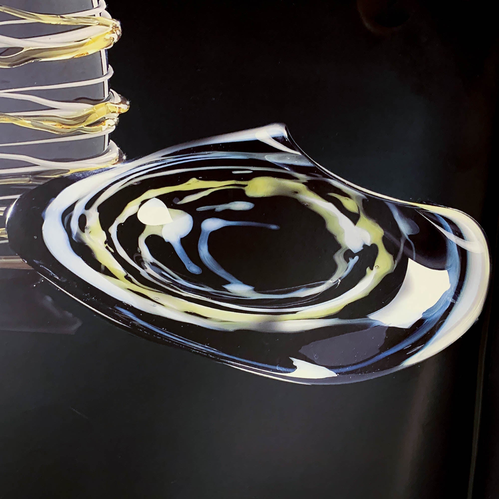 Choose between black or white glass, with white black and amber details made with the applicazione a caldo technique.