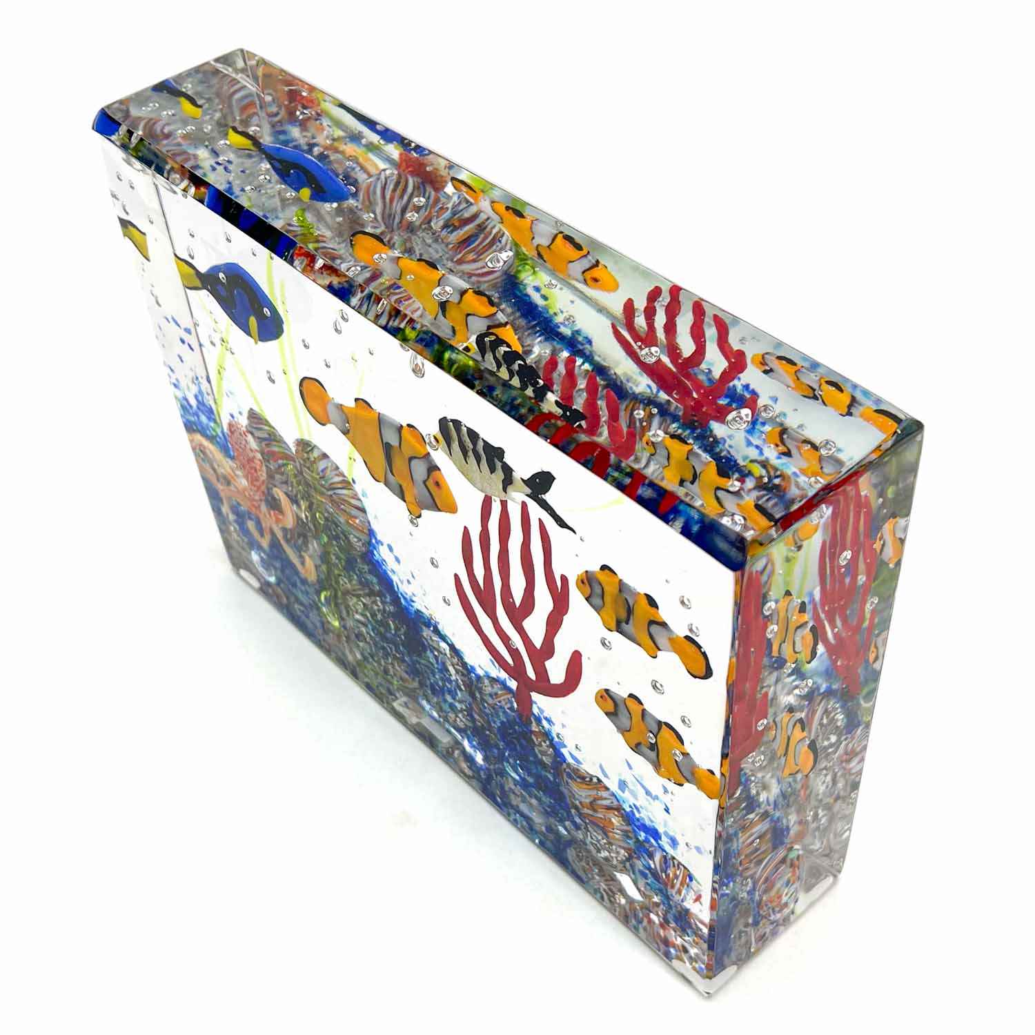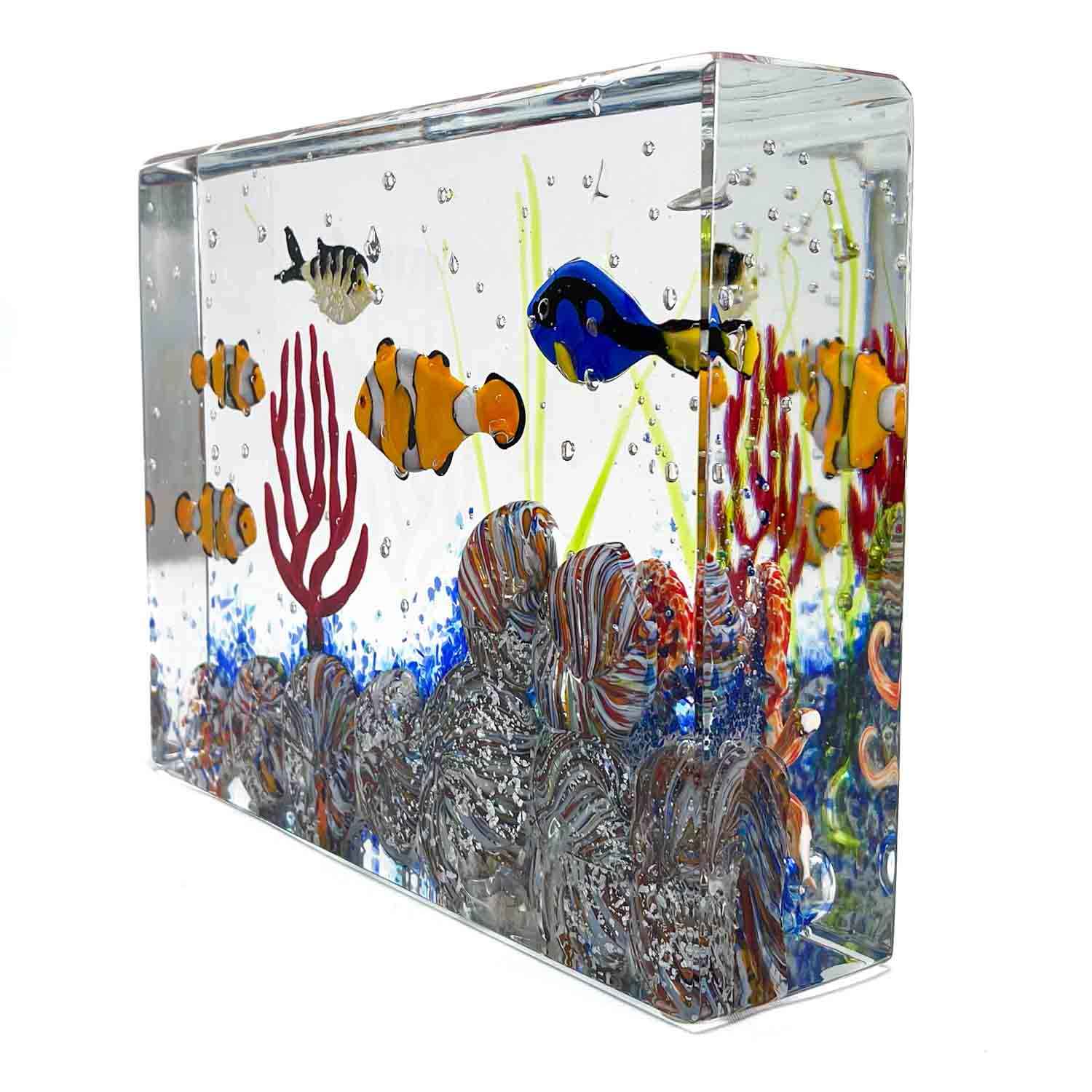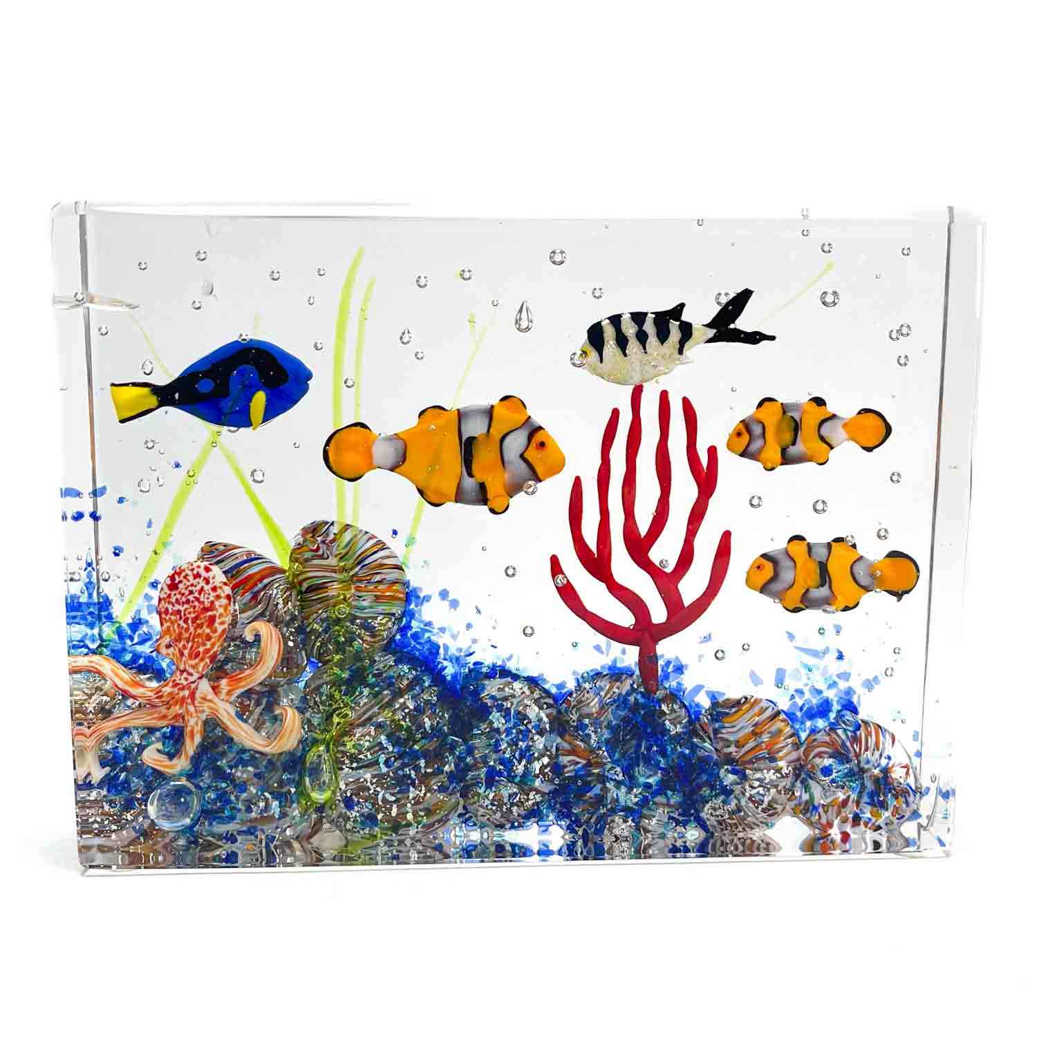 This Murano glass aquarium, handcrafted on the island of Murano, features a stunning marine scene. It includes three Nemo fish and a tropical fish, swimming alongside a Dory fish and an octopus.  A red coral stands out in the mix, enhancing the vibrancy of the reef. Each creature in this aquarium displays the exceptional skill of Murano artisans in capturing the beauty of marine life. Each of these animals is crafted with incredible attention to detail.