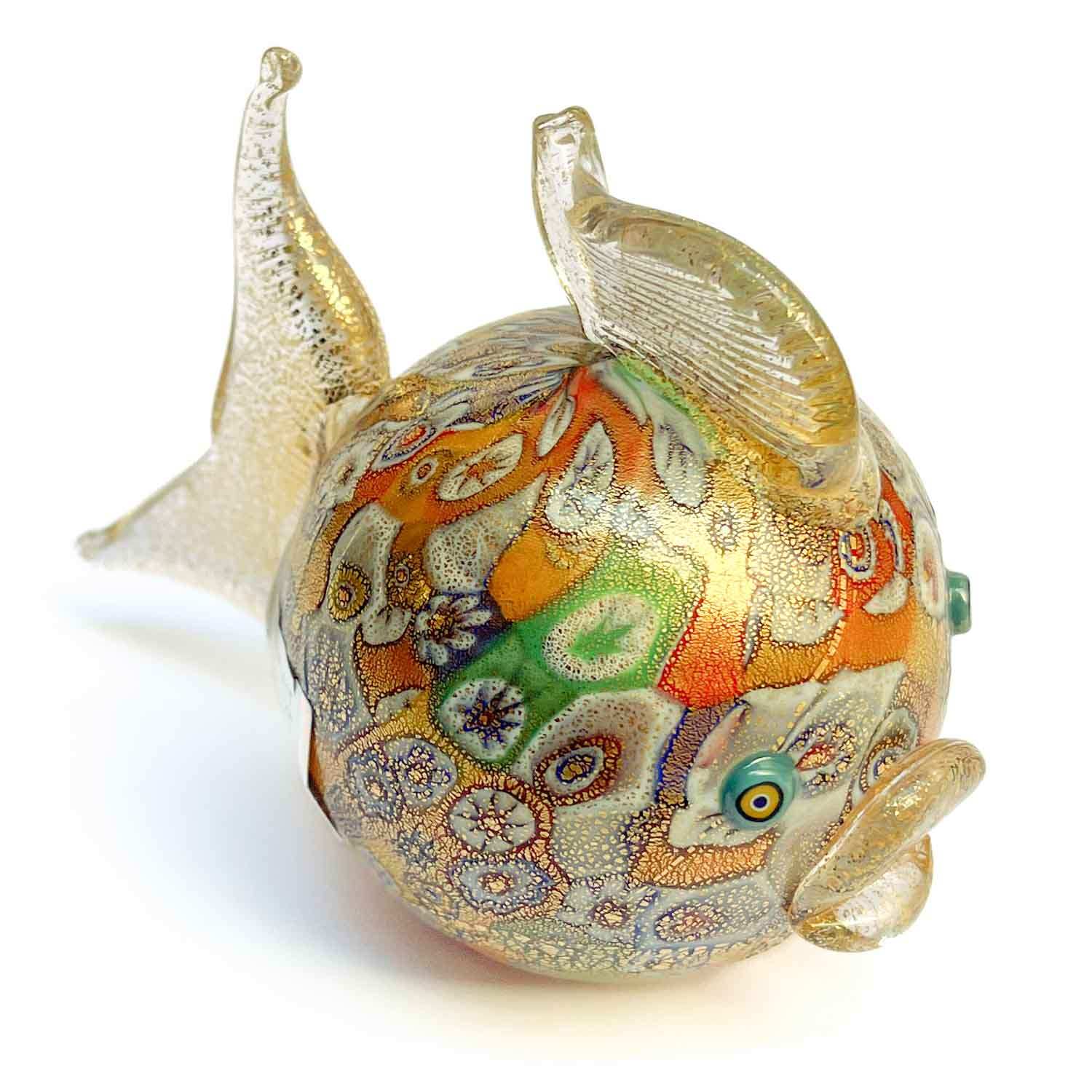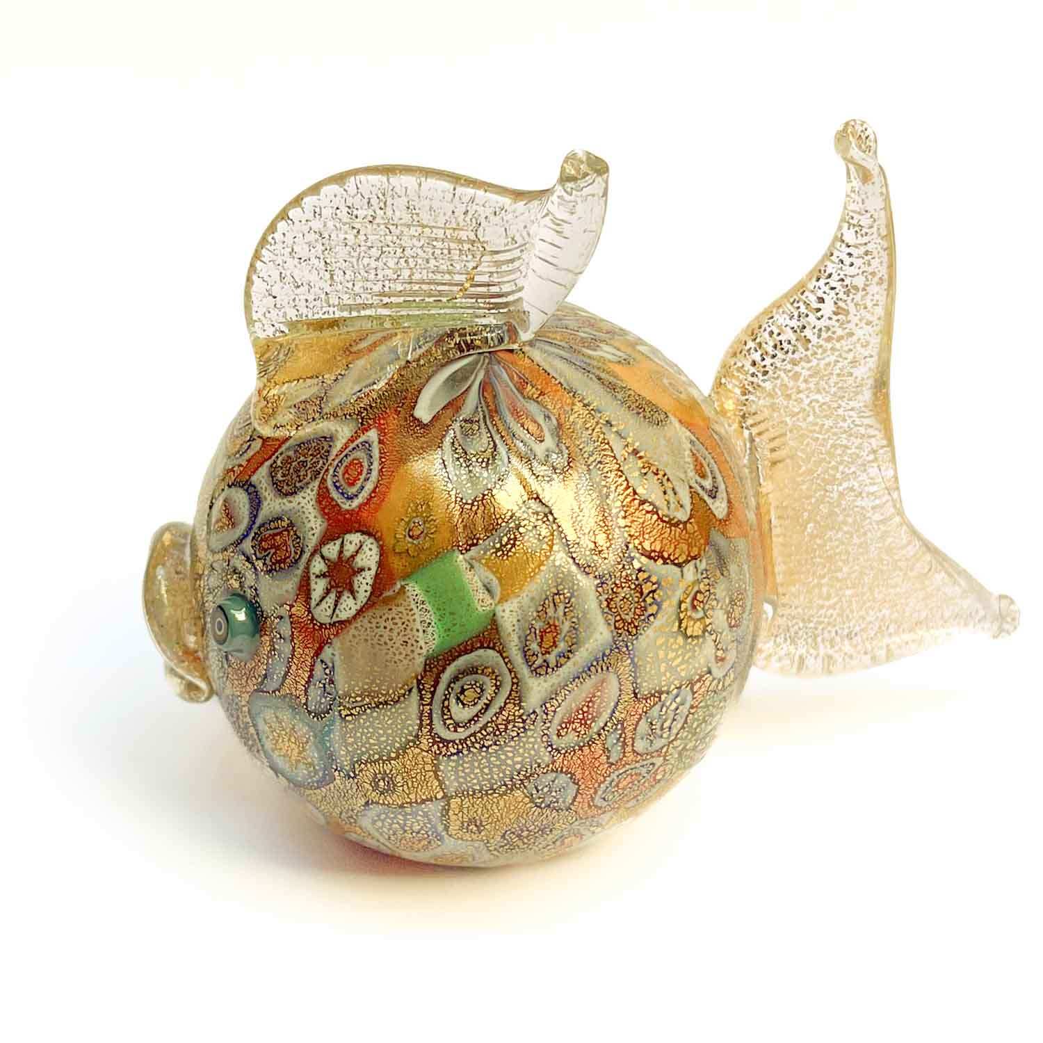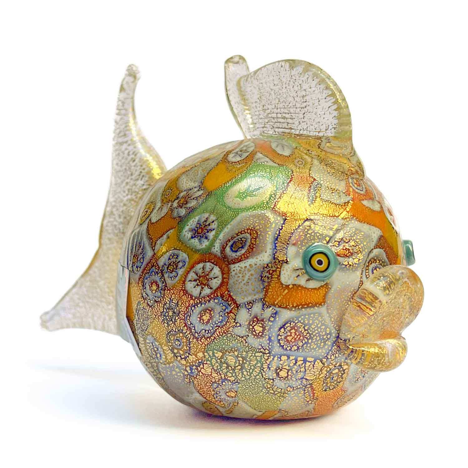 This amazing Murano Glass puffer fish is made is made of blown transparent glass in which surface are melted multicolored section of canna.