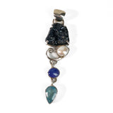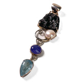 Pendant in 925 silver with Iron Fragments melted by the Etruscans, Aquamarine, Tanzanite and Freshwater Pearl. The Etruscan Pendant is part of "Storia di Mare" (Sea Stories) a collection of unique pieces inspired by whatever comes from the sea -shapes, colours, suggestions, as well as the materials themselves: pearls, shells, pieces of coral and even pebbles smoothed by the wavves- which become an integral part of the piece of jewellery itself.