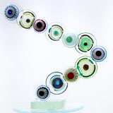 A composition of eyes - made with different techniques and using different colours - in the shape of an arrow.