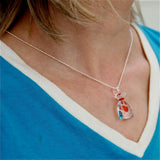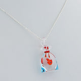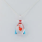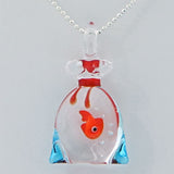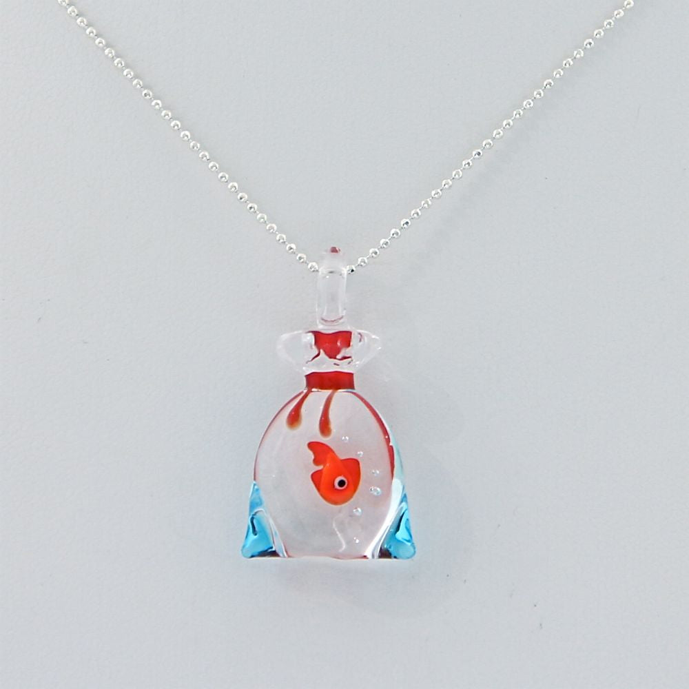 This funny necklace is coupled with a handmade pendant completely hand made in Murano glass. The working technique "al lume" has allowed to join different pieces of colourful glass to feature the details of the bag and of the fish inside This product has been handcrafted using the traditional techniques by the Muranese in our atelier.