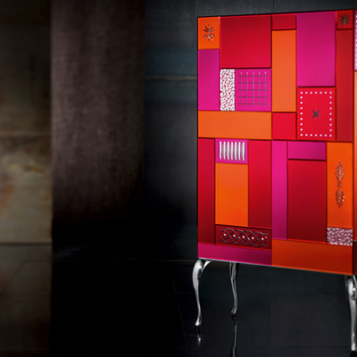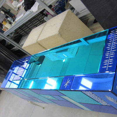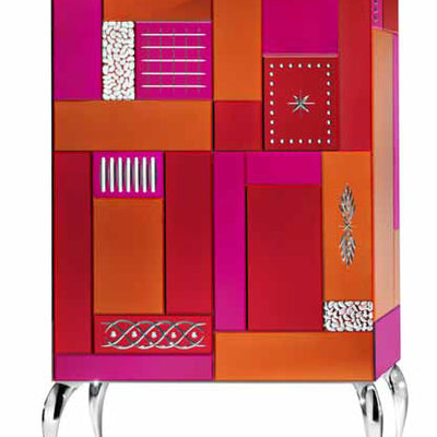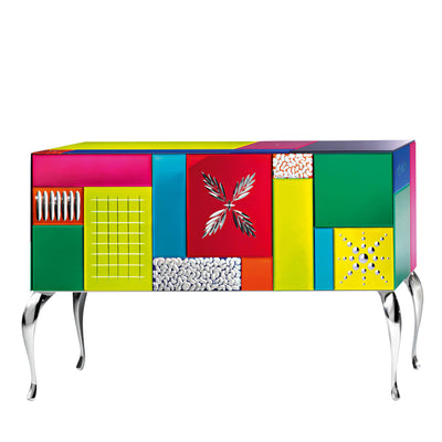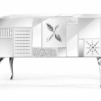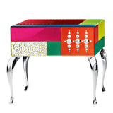 Nightstand with drawer in bevelled multicolor lacquered mirror with shiny silvered handmade engravings. Legs in glossy chromed aluminium.