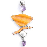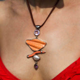 Pendant in 925 Silver, Lion Foot Scallop shell from the Pacific, orange Coral, faceted quartz and Amethyst and Coral cabochons. The pendant is part of Storie di Mare (Sea Stories), a collection of unique pieces inspired by whatever comes from the sea- shapes, colours, suggestions, as well as the materials themselves: pearls, shells, pieces of coral and even pebbles smoothed by the waves which become an integral part of the jewellery itself.