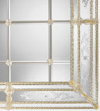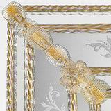 Big hand engraved mirror in Venetian style with central mirror divided in bevelled panels and Murano glass decorations in crystal gold colour. Structure in natural wood.