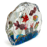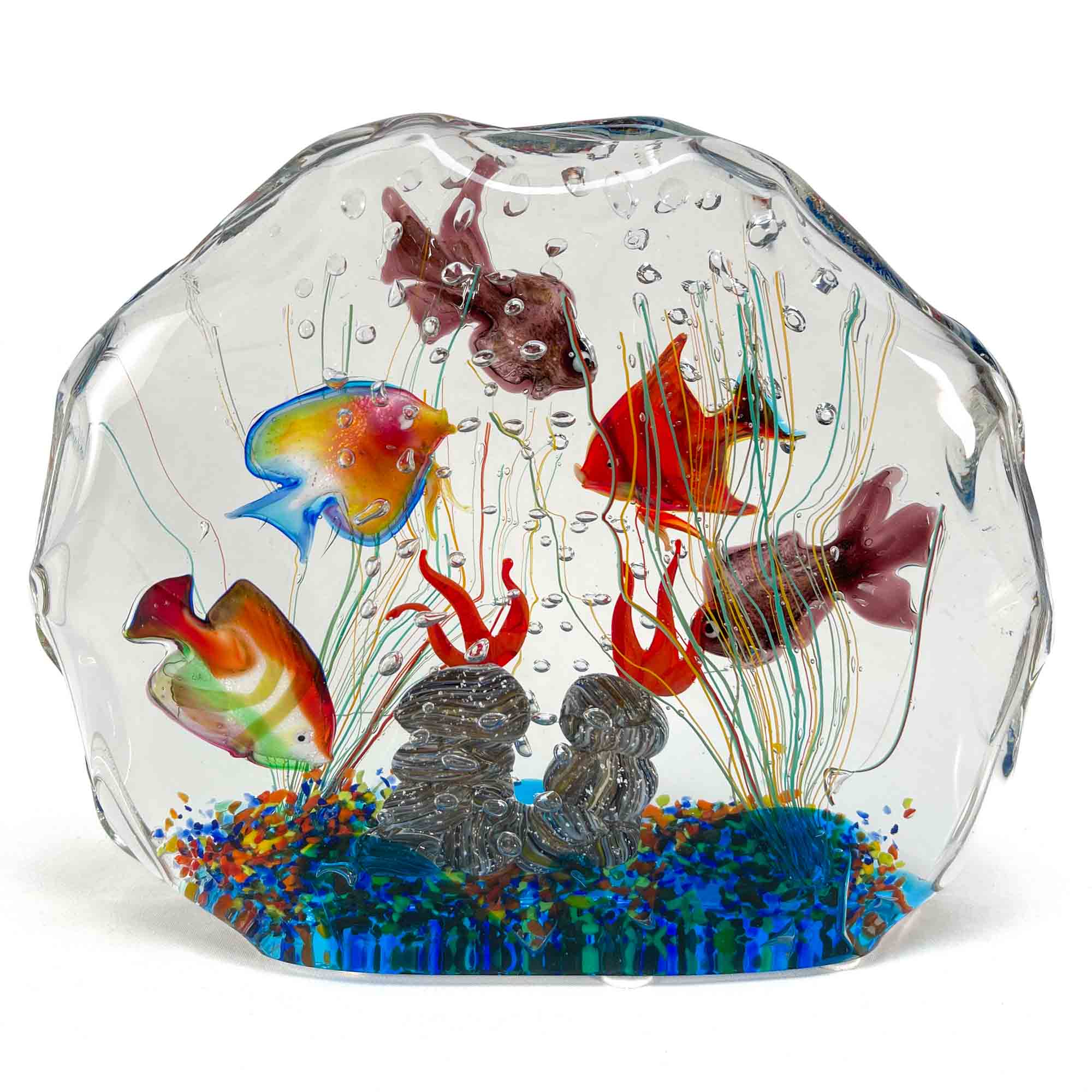 This Murano glass aquarium, handcrafted on the island of Murano, features a stunning marine scene. It includes four tropical fish, each distinct in shape and color, swimming alongside a jellyfish, two turtles and two octopuses.  A red coral stands out in the mix, enhancing the vibrancy of the reef. Each creature in this aquarium displays the exceptional skill of Murano artisans in capturing the beauty of marine life. Each of these animals is crafted with incredible attention to detail.