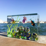 The main body is made in massello glass whereas the fishes and seaweed are prepared apart and then included in the crystal body.Read more about Murano glass Aquariums on our blog: click here