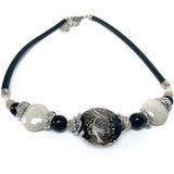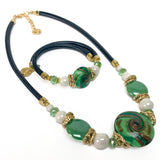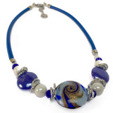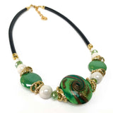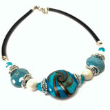 The main glass bead is made using the avventurina and foglia d'oro techniques.