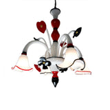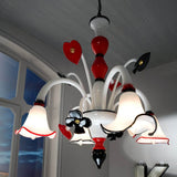 A chandelier in white Opalino Murano glass, with red and black elements and details. Decorated with spades, hearts, diamonds, clubs.