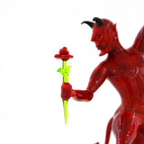 Notably, he holds a flower in his hand, adding a unique contrast between the diabolical and the delicate, symbolizing a complex duality.