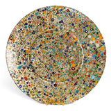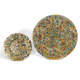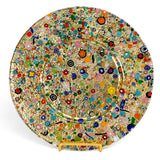 Round plate made of Murano glass crystal with gold leaf and submerged murrinas, which means that the murrinas are set in the frame, with the vetrofusione technique.