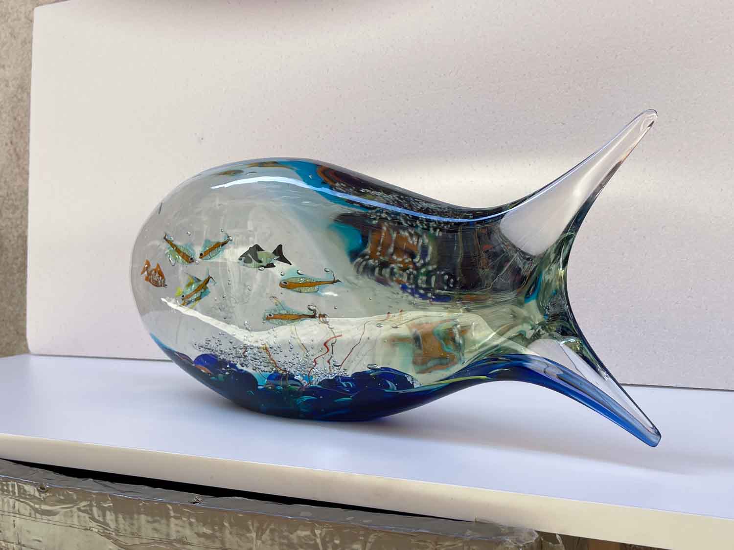 This fish-shaped aquarium is twenty-two centimetres (8.66 inches), forty-nine centimetres (19.29 inches), and ten centimetres (3.94 inches) in depth. The product is MuranoVitrum-guaranteed and comes with a certificate that serves as proof of its authenticity.