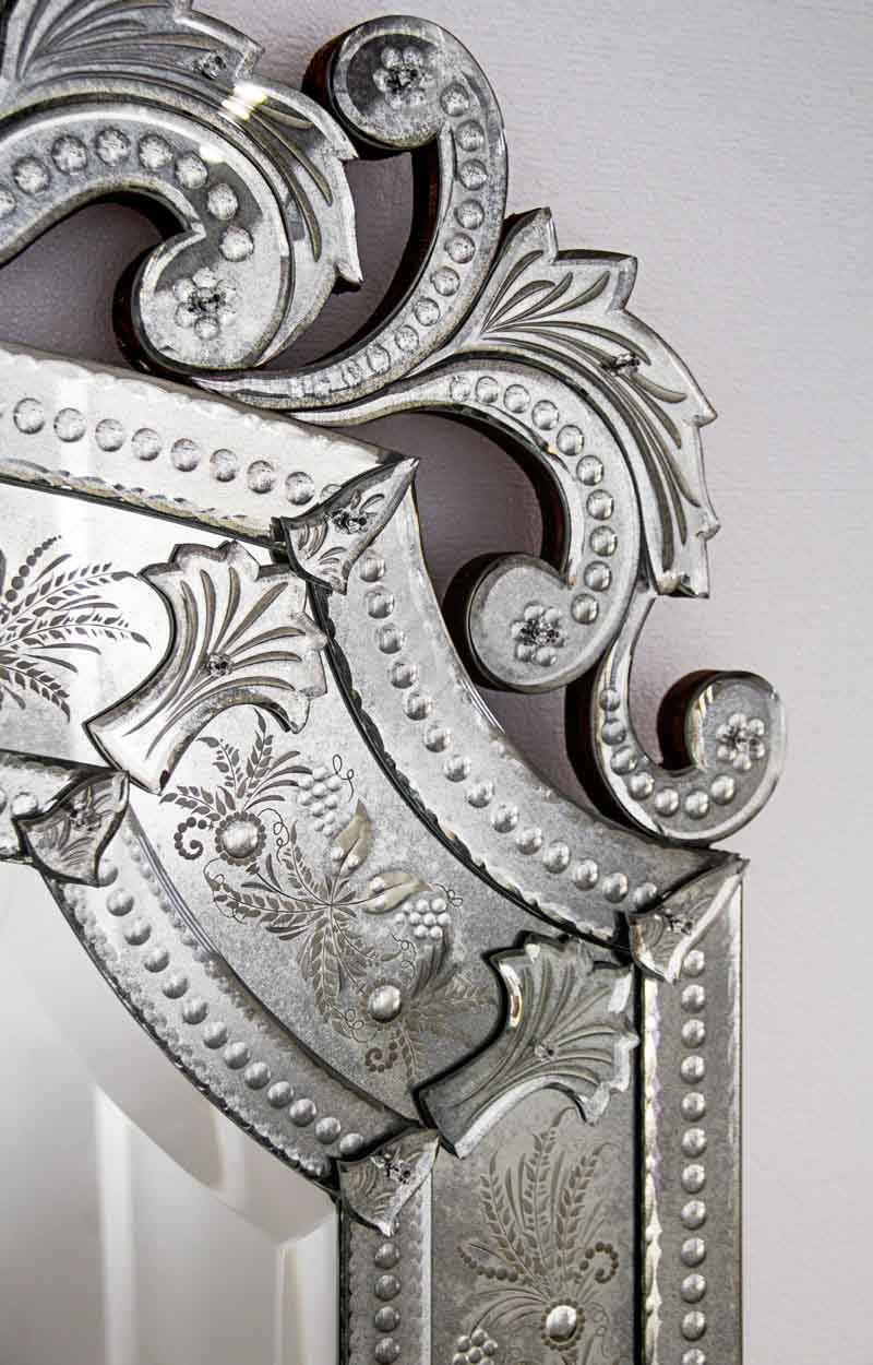 Elegant 14th-century style Venetian mirror, engraved and beveled by hand.