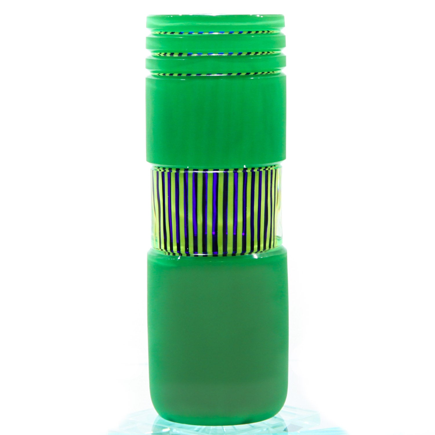 Designed in the 90's by Stefano Toso, handmade in Murano by Romano Donà, the vases belonging to the "Arthur Collection" are a tribute to the legendary King Arthur and are nowadays very difficult to find on the market. This vase is made of incamiciato glass, with inclusion of coloured canne, then grinded to obtain a smooth and perfect finish. The very complex techniques used on a vase of these dimensions and the flawless results show the great skills of the maestro Romano Donà. See also the Blue version.