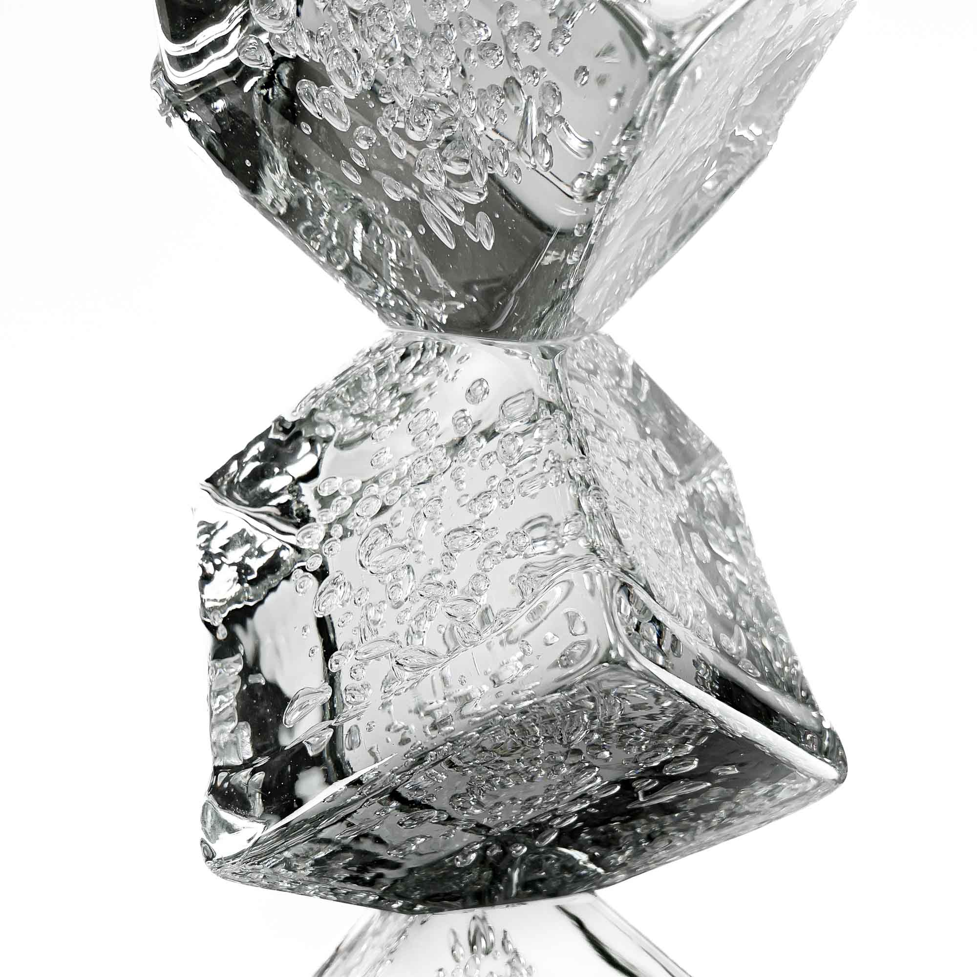 This abstract sculpture is an extraordinary work of art made of authentic Murano glass. It resembles four large ice cubes, each of which has been crafted with care and precision. The glass has a translucent quality that allows light to pass through, casting a warm glow and adding depth to the overall design. The soft, cubic curves create an illusion of solidity and weight, while the delicate workmanship of the glass gives a feeling of fragility and eternity. The use of different shades of clear glass creates an illusion of melting and refreezing, giving the piece a sense of movement and life. This abstract sculpture is a true masterpiece and an addition to any art collection.