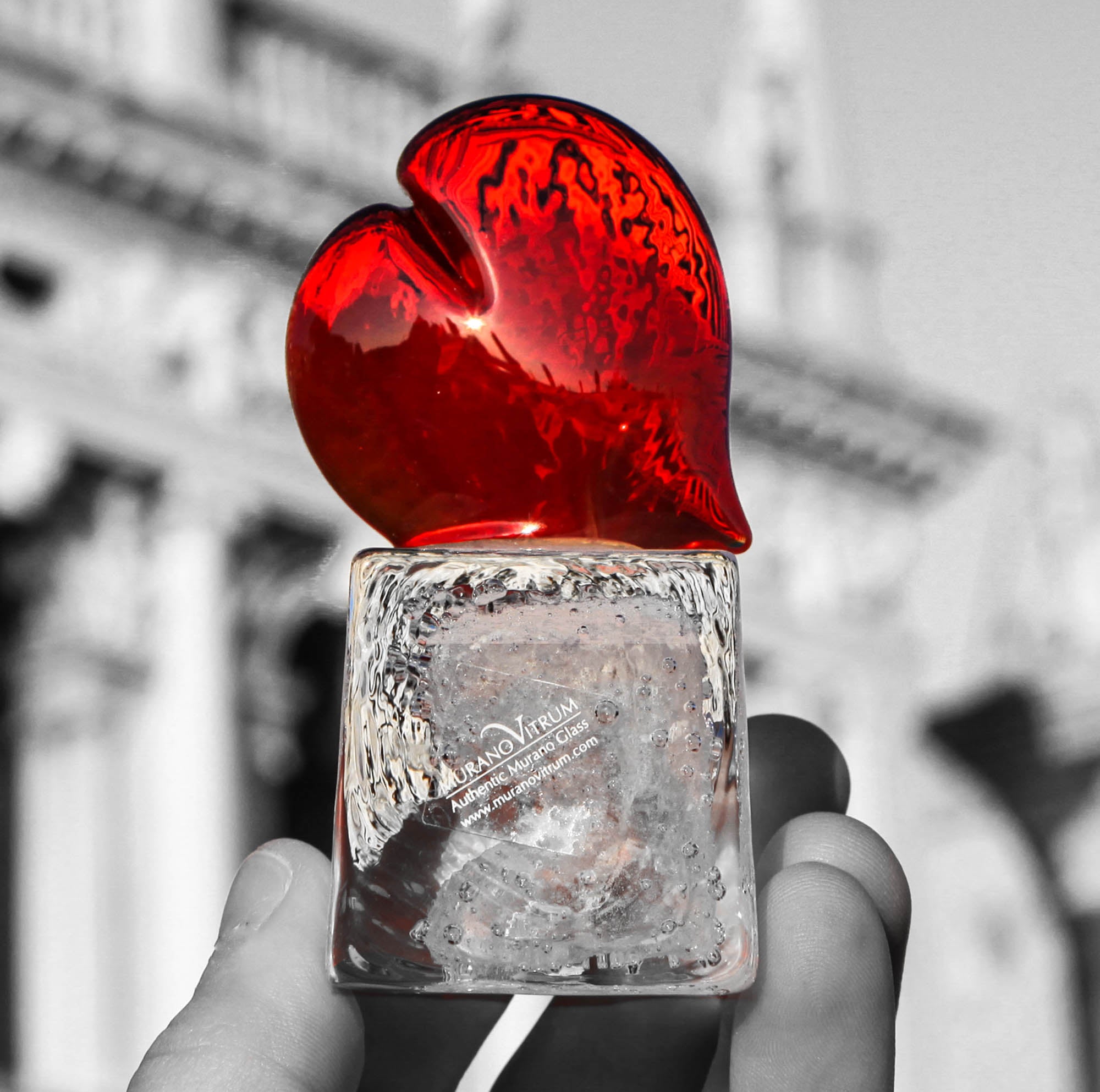 The white base with little bubbles inside - which recall an ice cube - and the red heart on the top have been entirely handmade in our atelier in Murano according to the ancient Muranese technique called a lume.