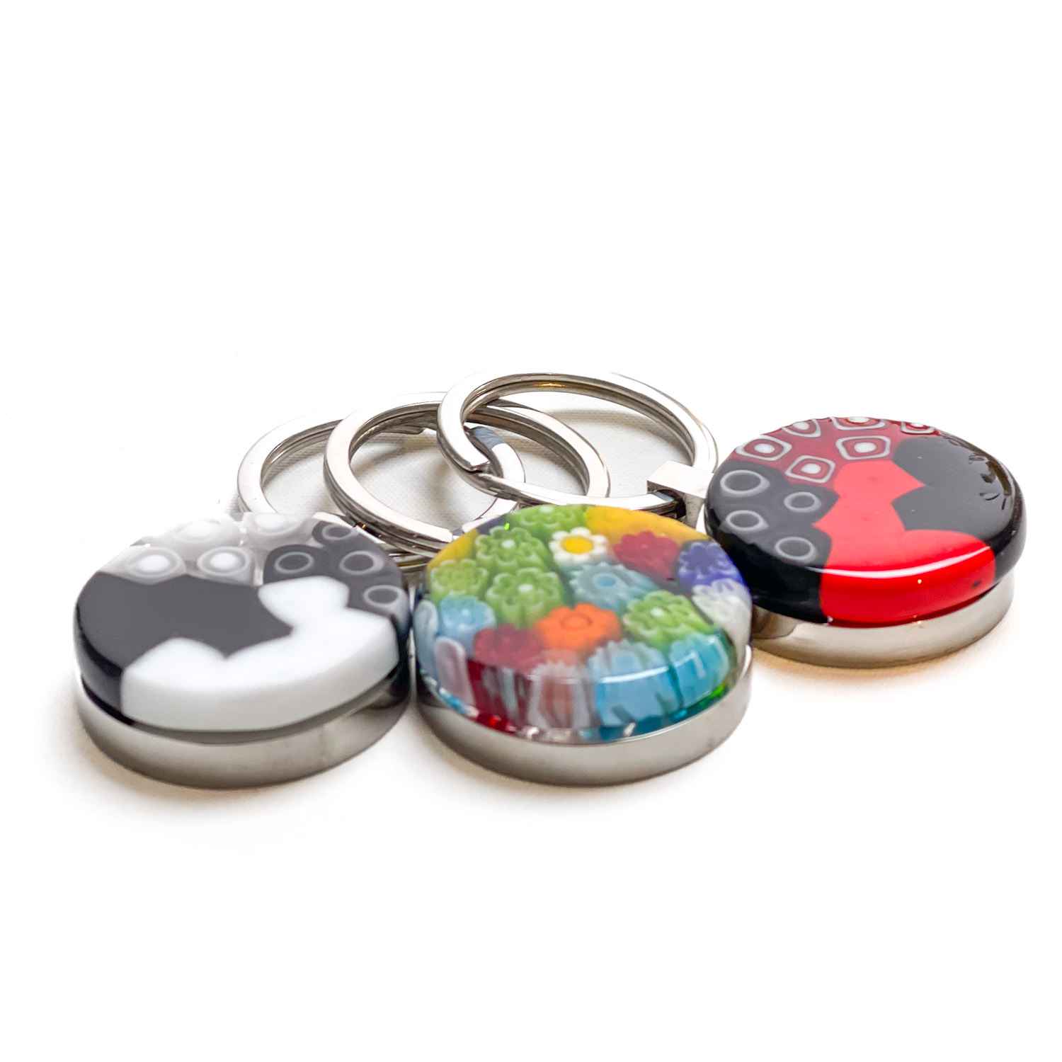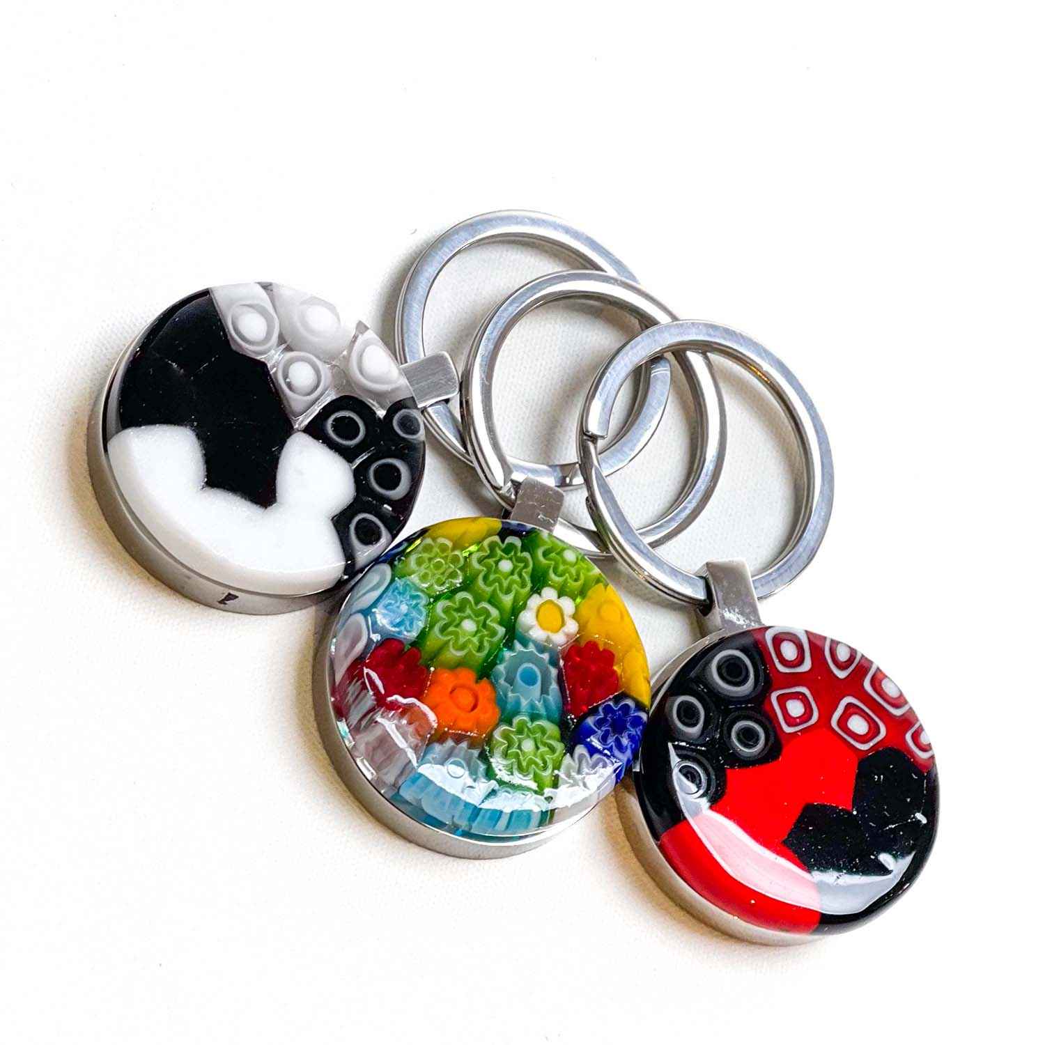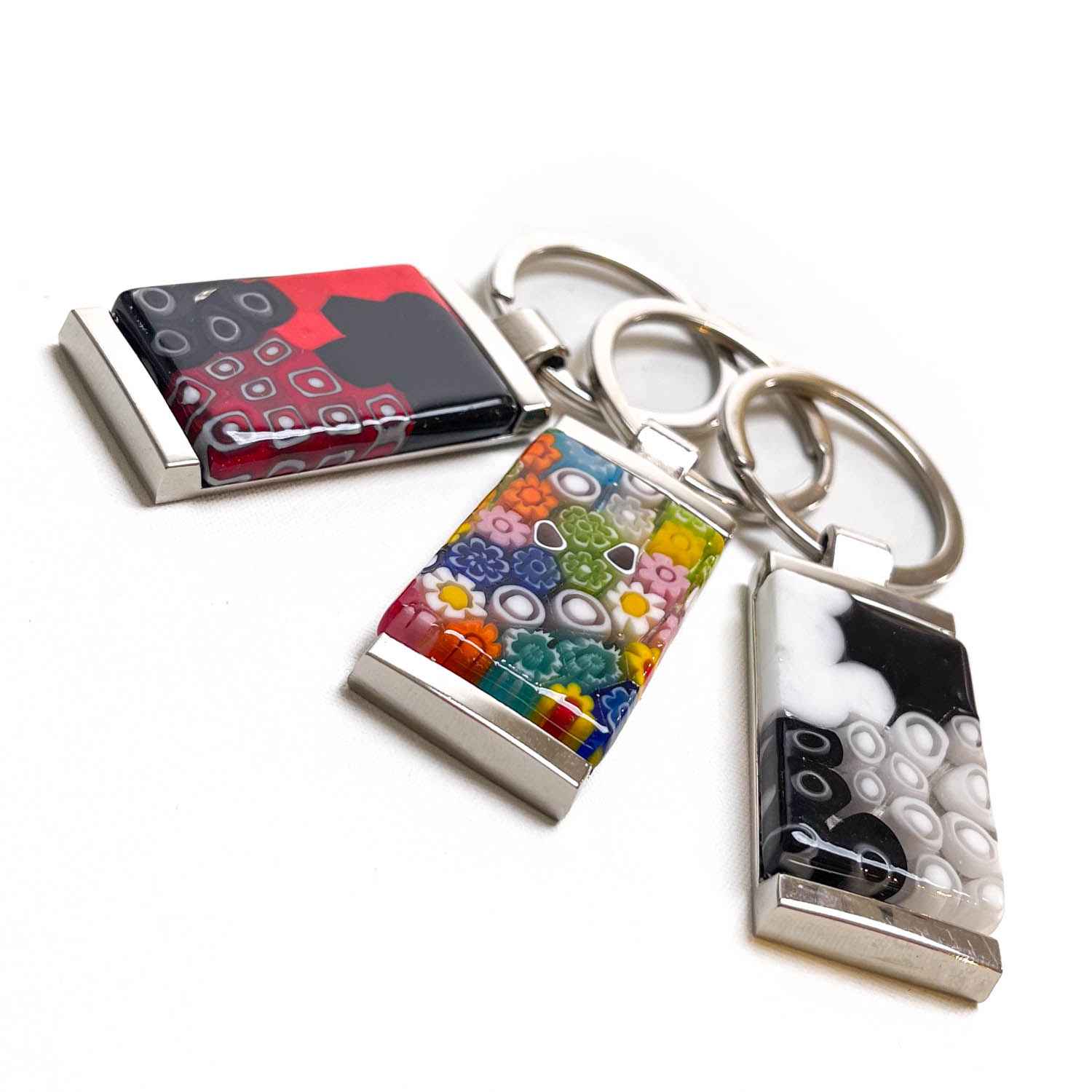 Elegant rectangular keychain in Murano glass. The glass, bounded by two shiny metal bands, is characterized by a decoration with murrine that create a unique and intense pattern. The keychain is available in 3 variants: millefiori, black and white, red spot. Every product, due to the handmade processing, is unique and may differ slightly from those pictured. Handmade in our atelier in Murano island, according to the ancient techniques.
