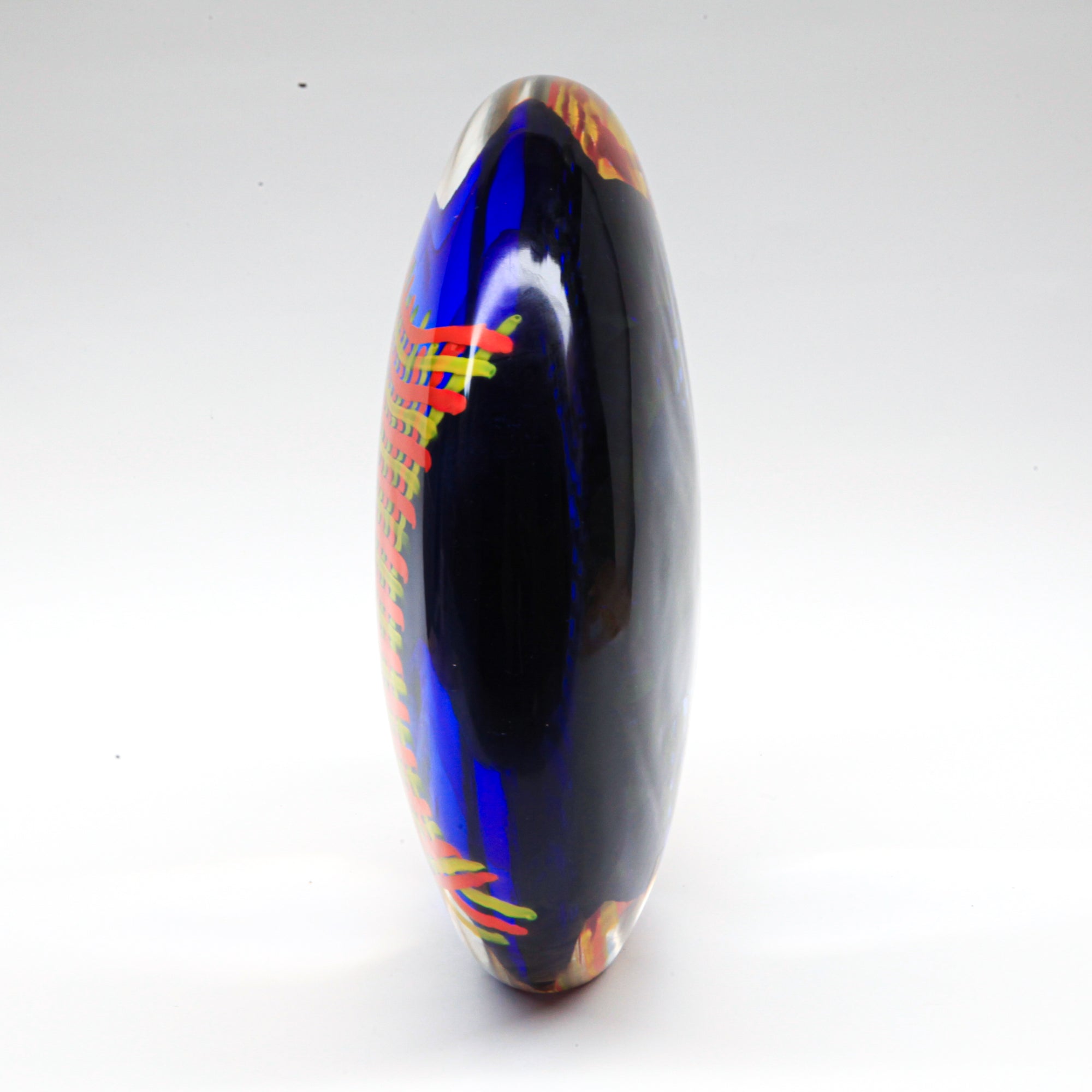 This work belongs to the period, the shape inspired by the works of Livio Seguso is enhanced by submerged colored reeds that form the background of the concentric figure made with sbruffi.
