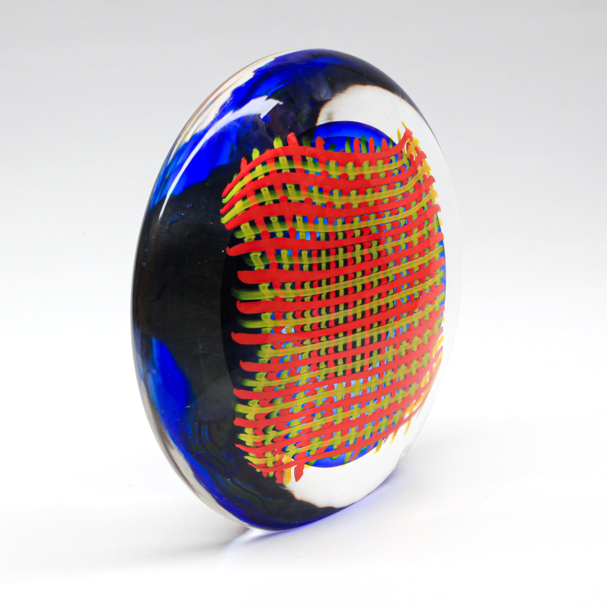Murano glass disk sculpture, created with Muranese crystal and coloured cannas included with the sommerso technique.