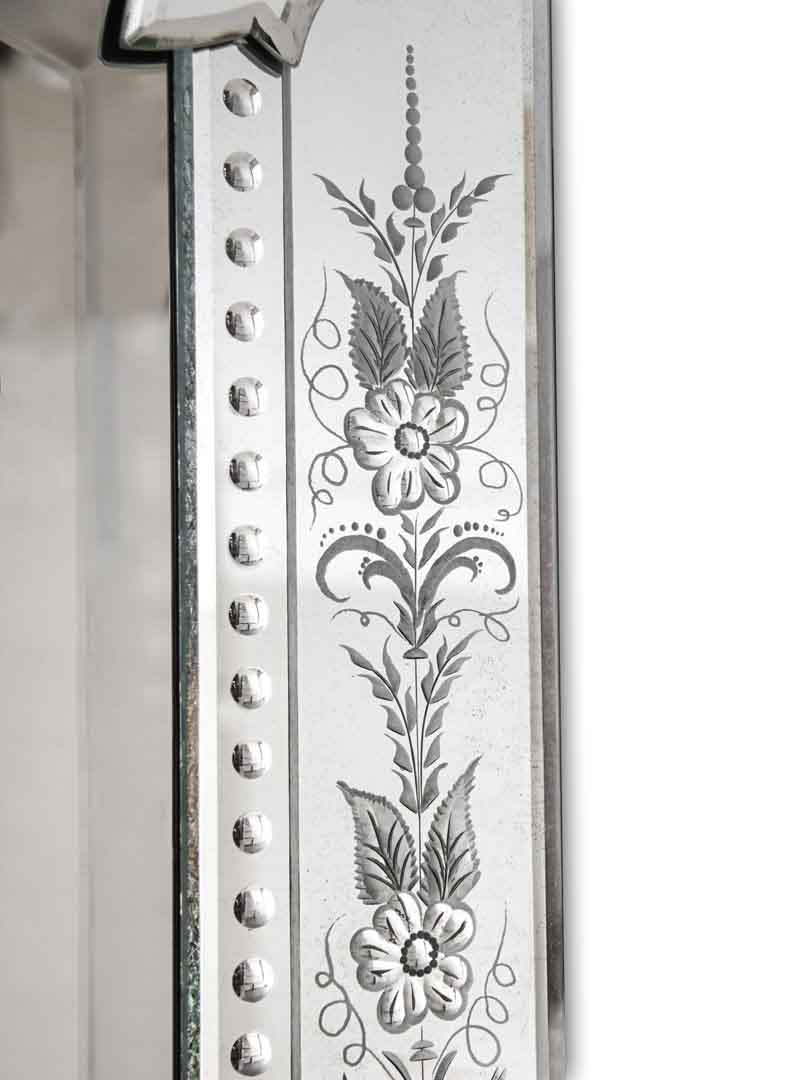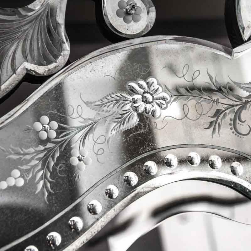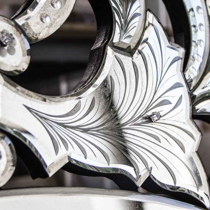 Application élaborée de petites pièces de miroir assemblées et décorées de gravures à la main.