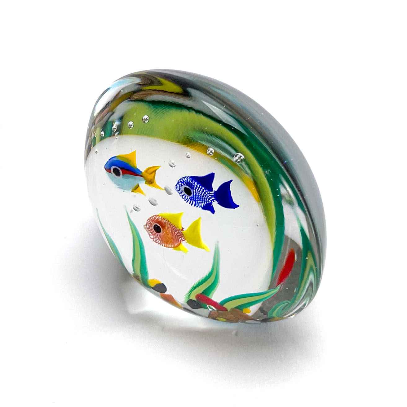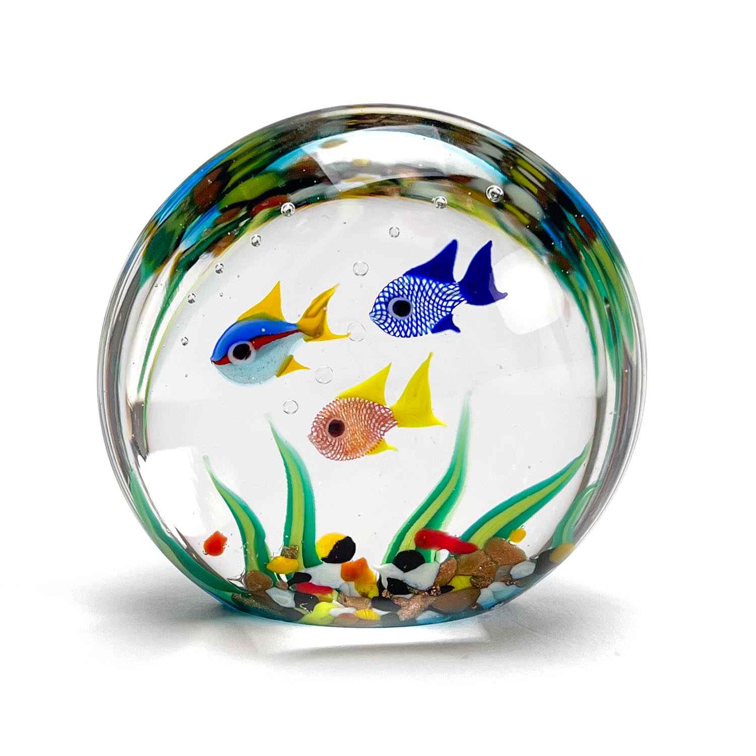 Il pesce tropicale in miniatura dell'acquario da collezione è alto sei centimetri (2,36 pollici) e largo 6,5 centimetri (2,56 pollici), il che lo rende della dimensione giusta per il tuo tavolo centrale. Il prodotto è garantito MuranoVitrum ed è accompagnato da un certificato che ne attesta l'autenticità.