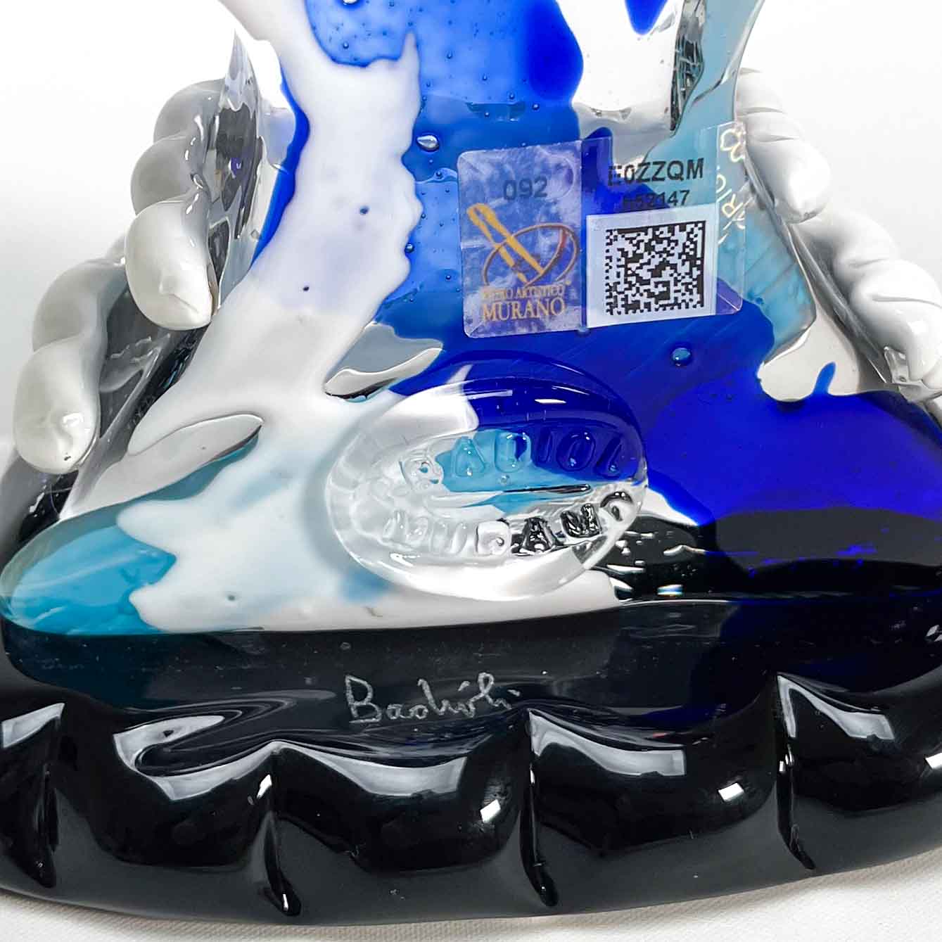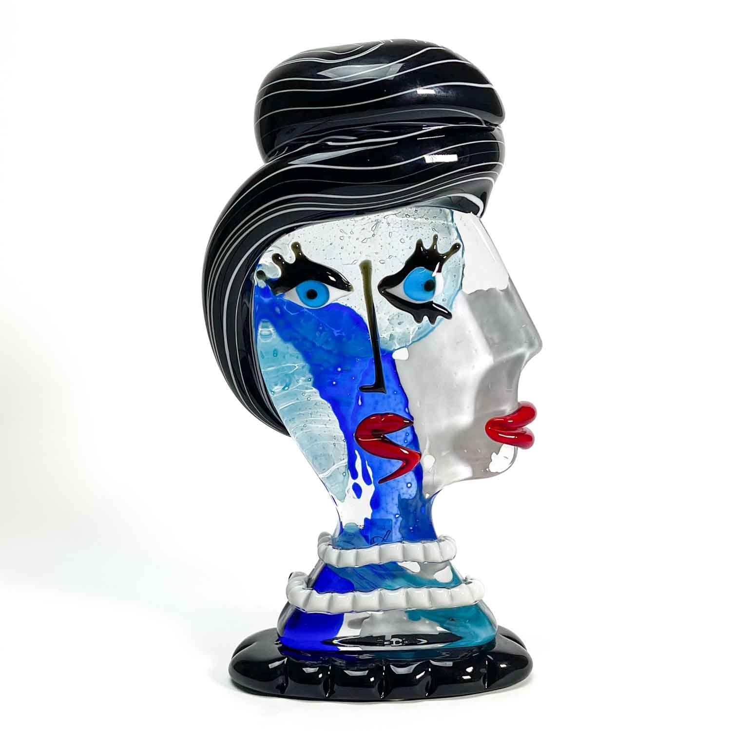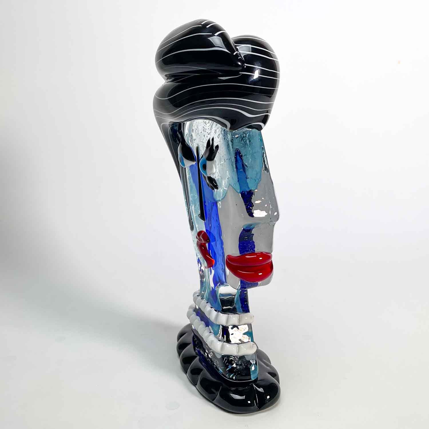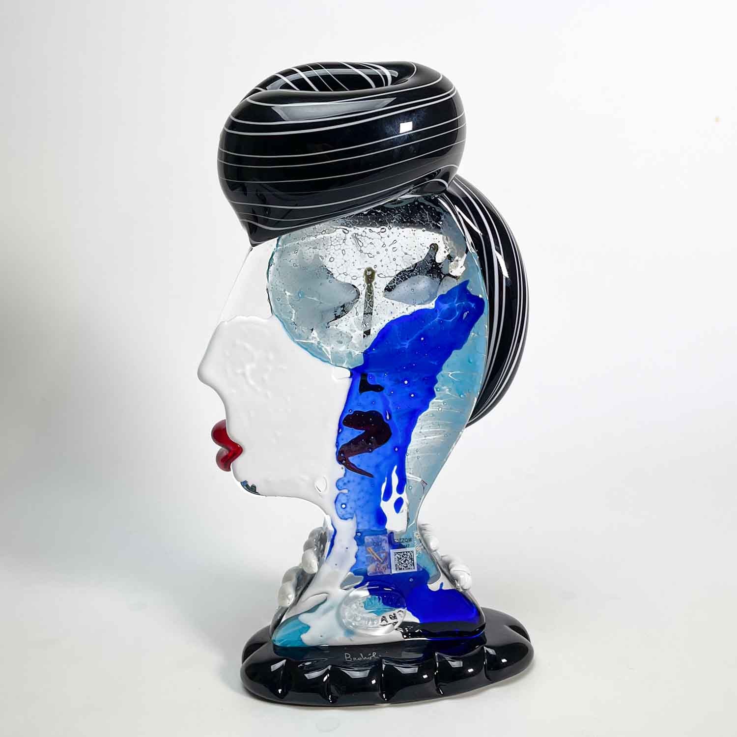 From our workshop, we present a tribute to Pablo Picasso with a series of sculptures inspired by the revolutionary work of this master of cubism. Badioli's expertise in Murano glass techniques shines through in this art specimen. The main structure of the face is made of solid glass, with additional elements applied using the applicazione a caldo technique. Details such as eyes, hair, and eyebrows are meticulously added while the components are still hot.