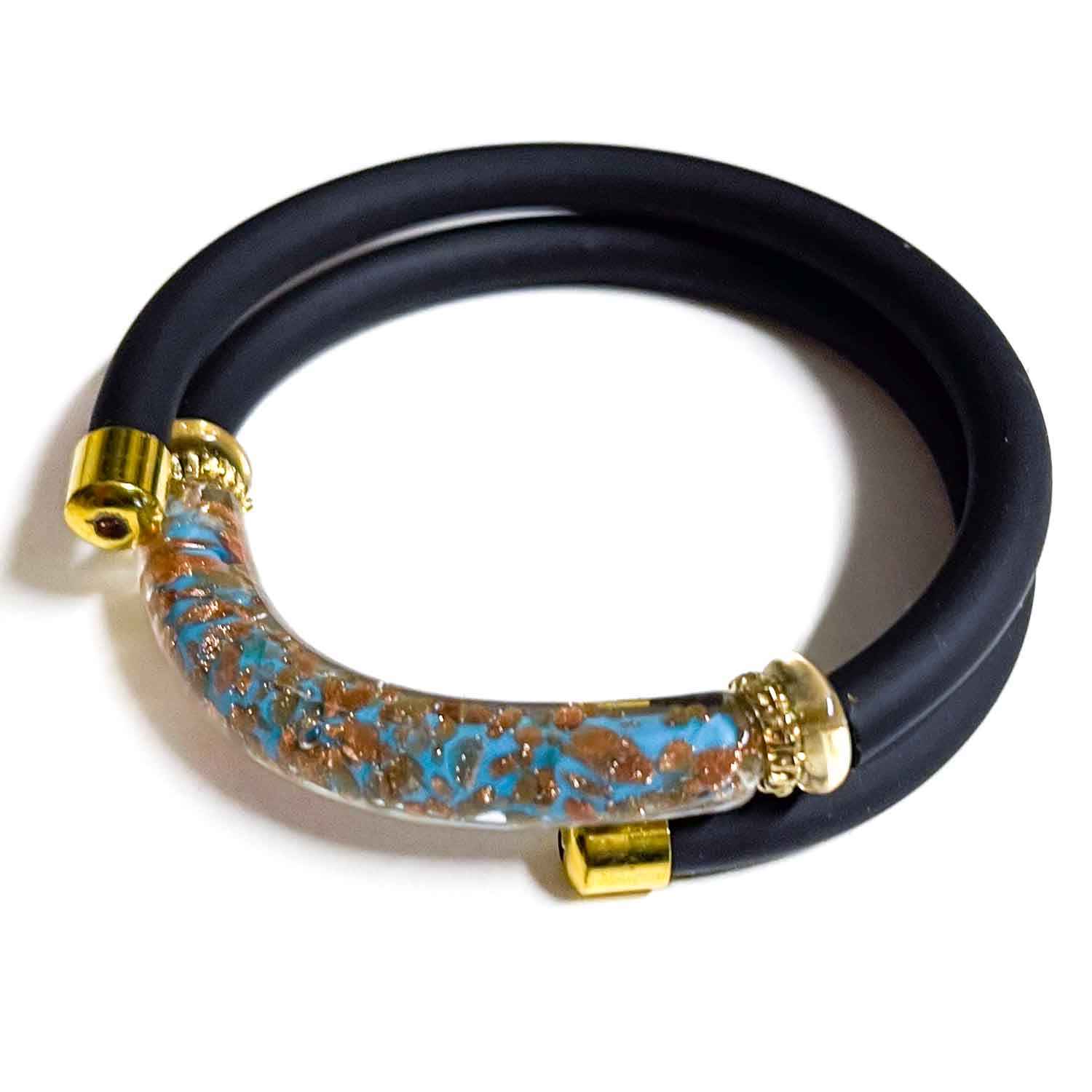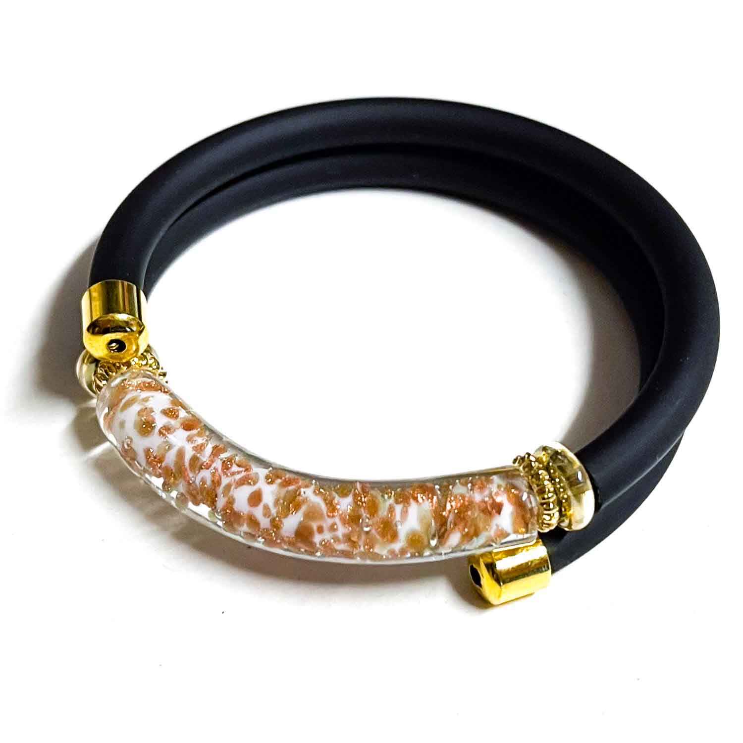 Bracciale in vetro di Murano con fascia in caucciù. Perla di vetro realizzata con la tecnica dell'avventurina e della foglia d'oro .