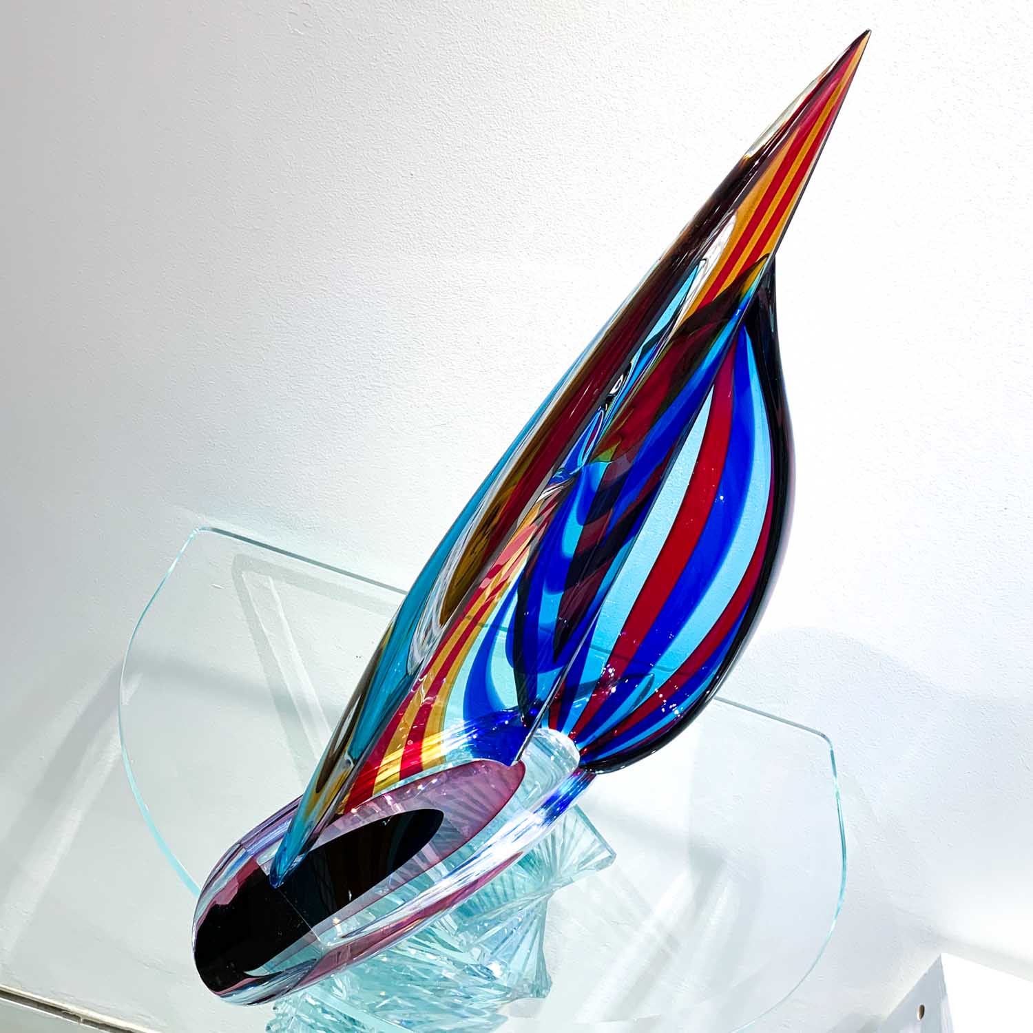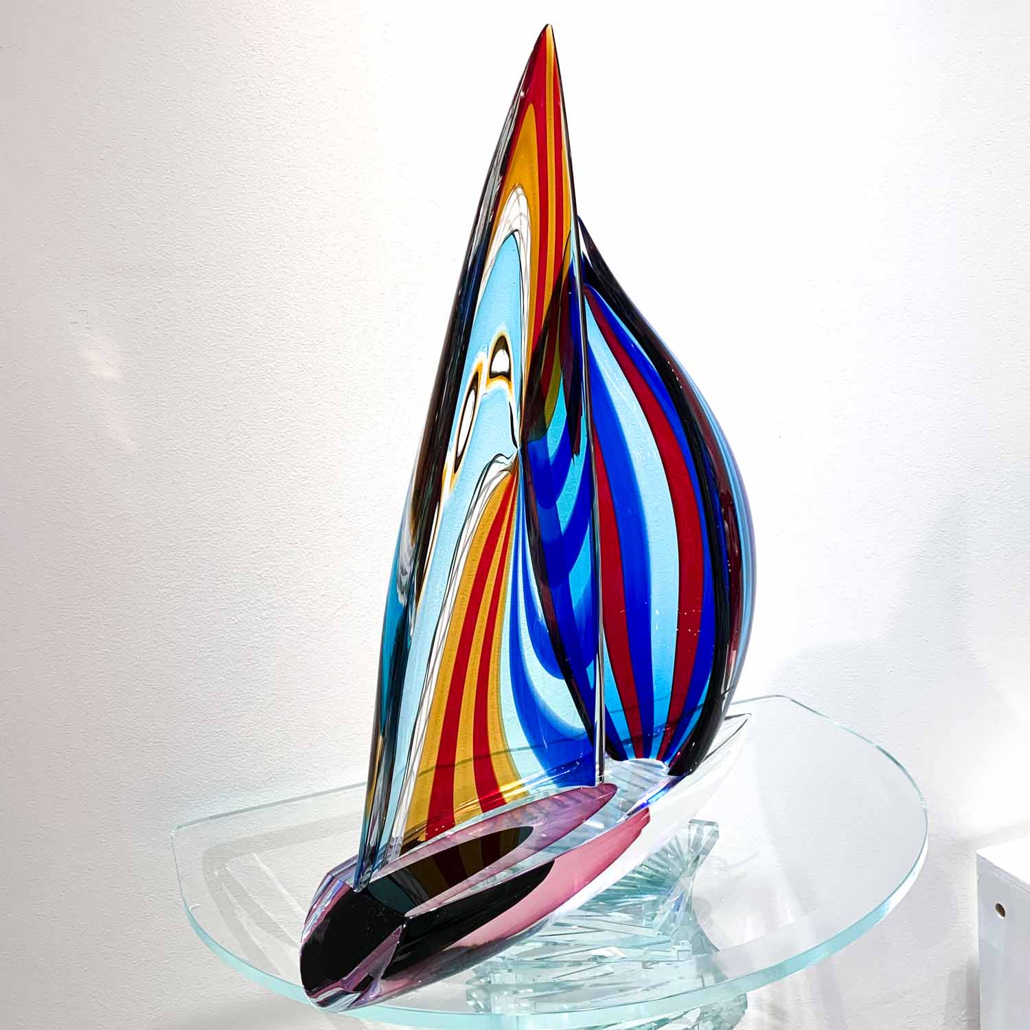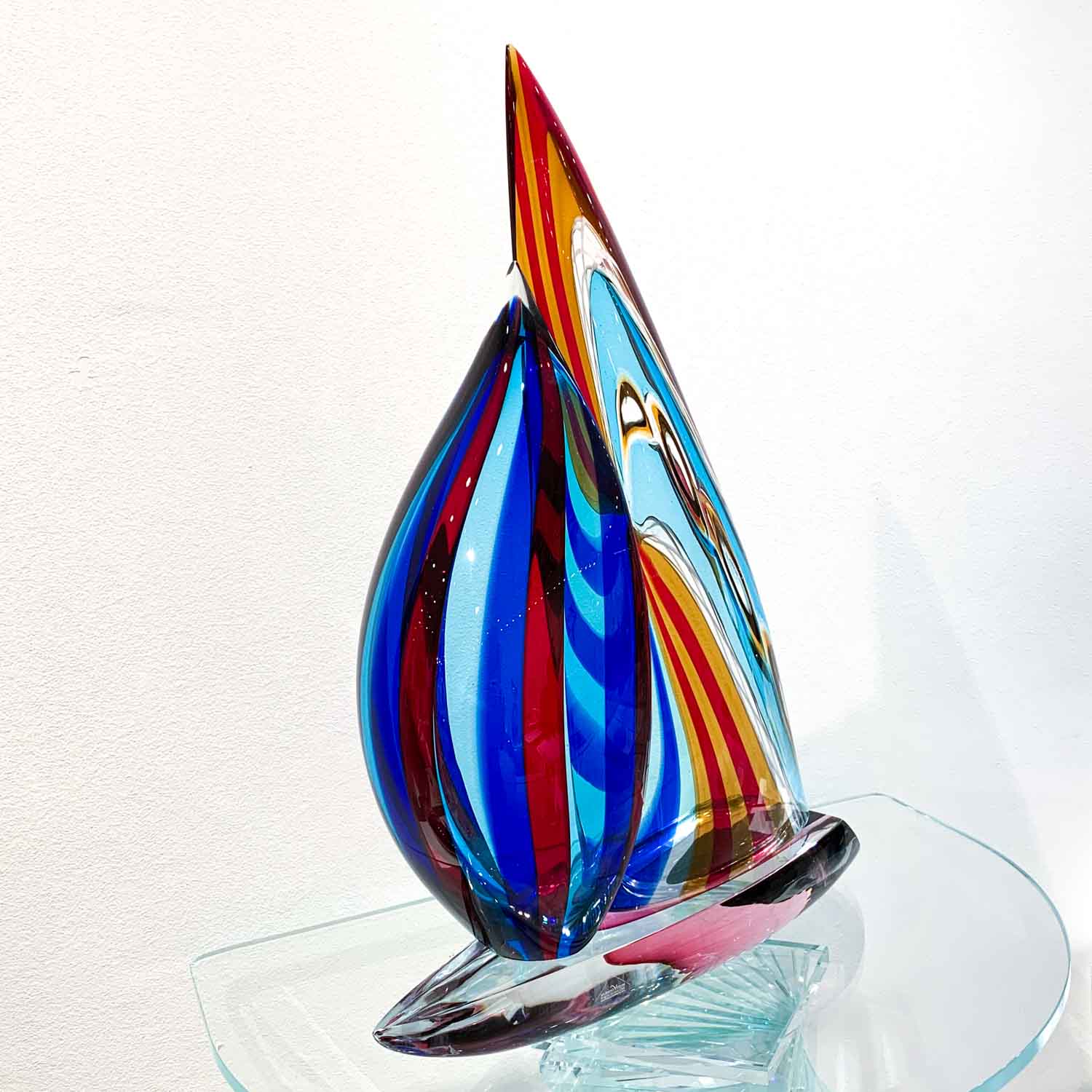 Uno splendido esempio di arte muranese: ogni pezzo di questa barca a vela è realizzato a mano separatamente con inclusioni di canna multicolore. I suoi colori vibranti sono stati ispirati dai colori di Venezia e dalla scintillante luce estiva della laguna. Realizzato a mano a Murano da artisti selezionati, per la nostra galleria; seguendo le antiche tecniche.Firmato in basso.
