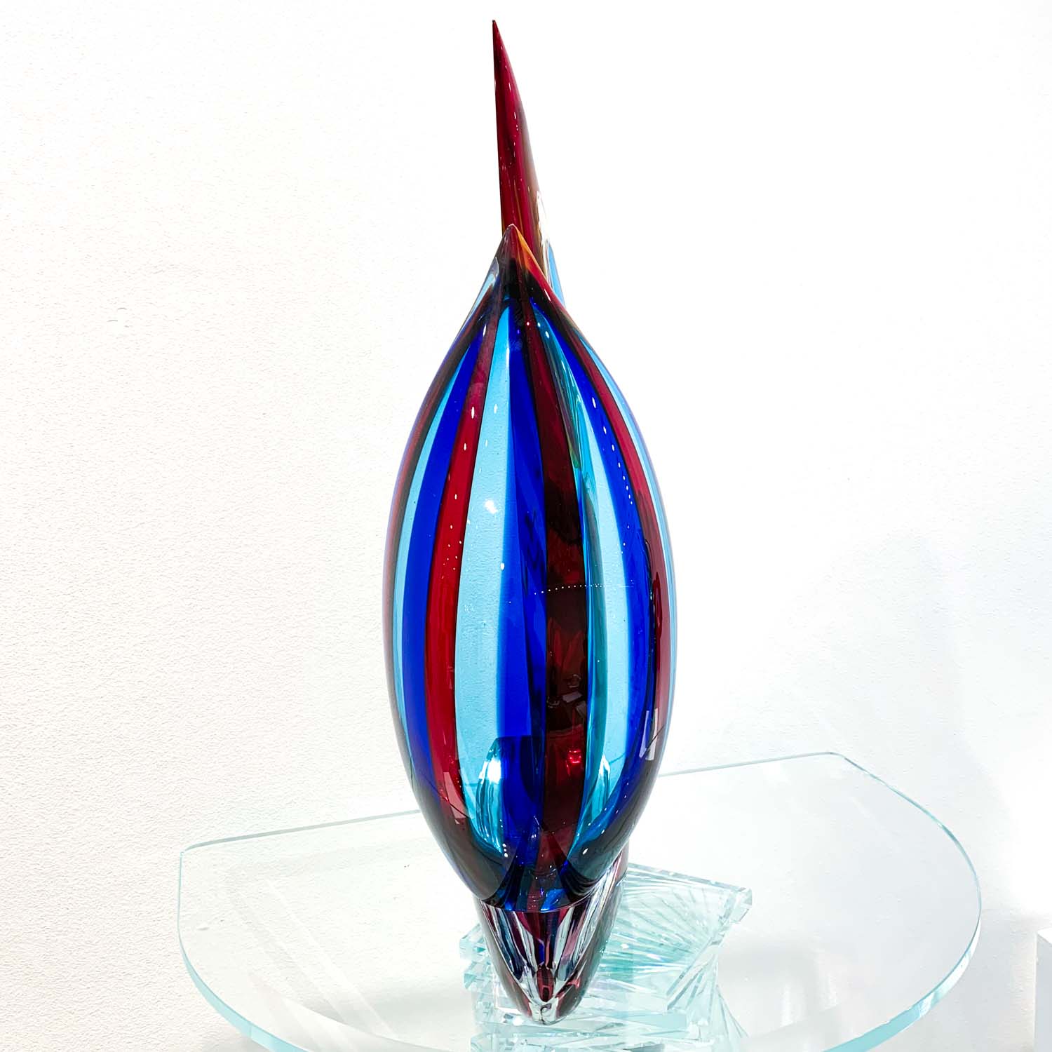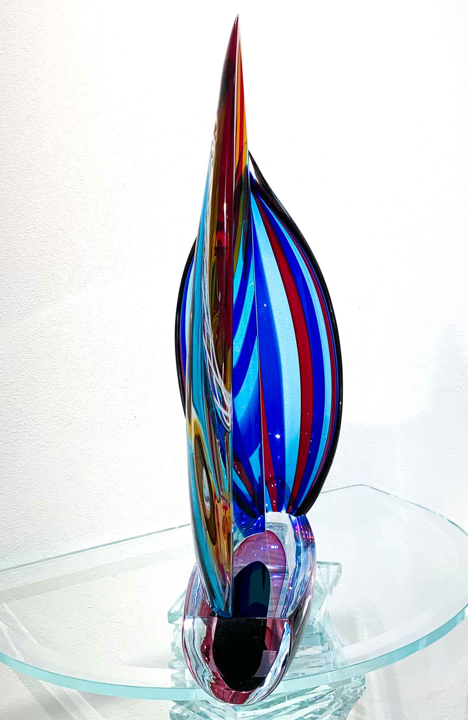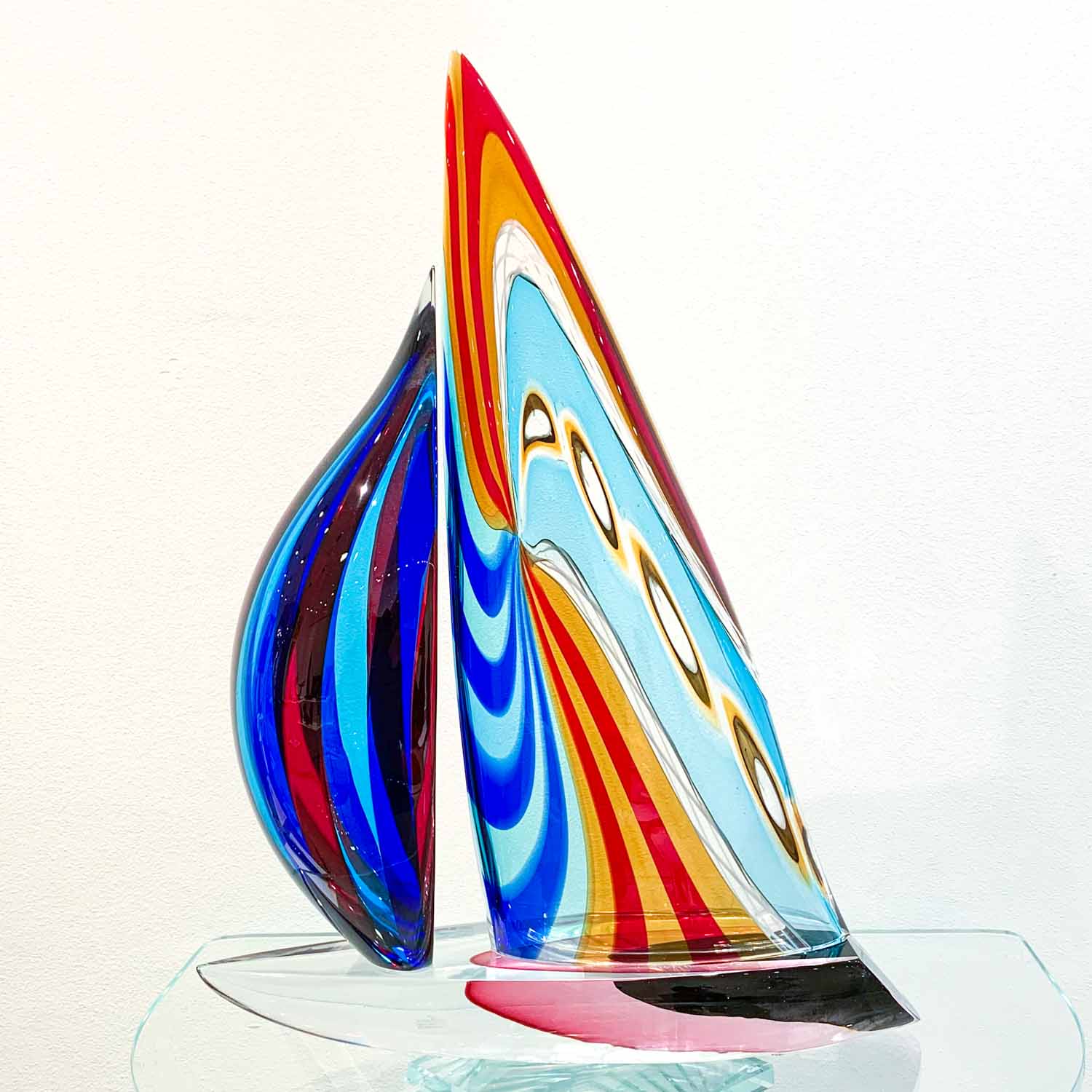 Uno splendido esempio di arte muranese: ogni pezzo di questa barca a vela è realizzato a mano separatamente con inclusioni di canna multicolore. I suoi colori vibranti sono stati ispirati dai colori di Venezia e dalla scintillante luce estiva della laguna. Realizzato a mano a Murano da artisti selezionati, per la nostra galleria; seguendo le antiche tecniche.Firmato in basso.
