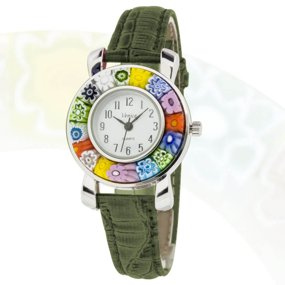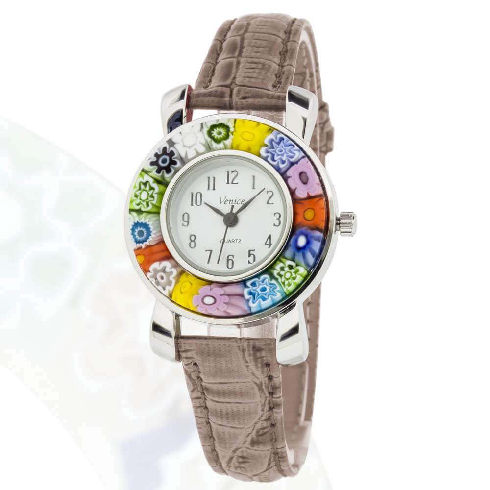 The minute track is surrounded by a bezel od colorful Murano glass murrine. Glossy white dial with black numbers, easy to read.