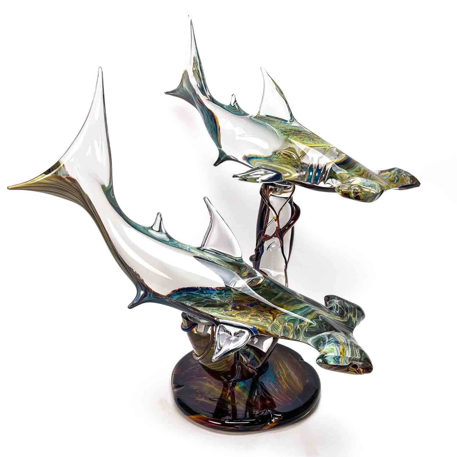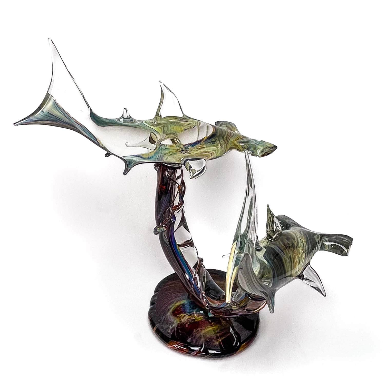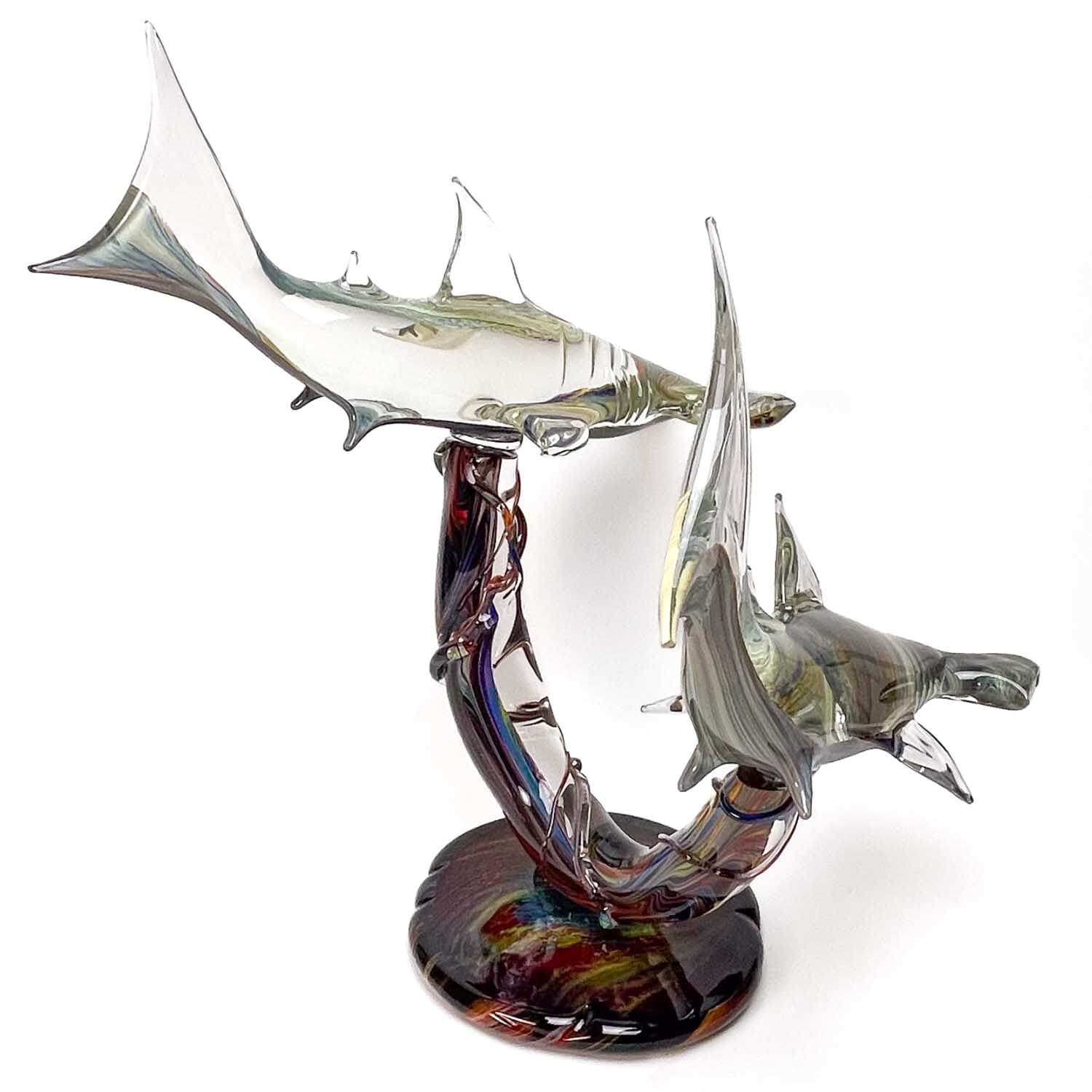 Sculpture of two Hammerhead sharks in Murano glass, made using the Massello and Calcedonio techniques.
