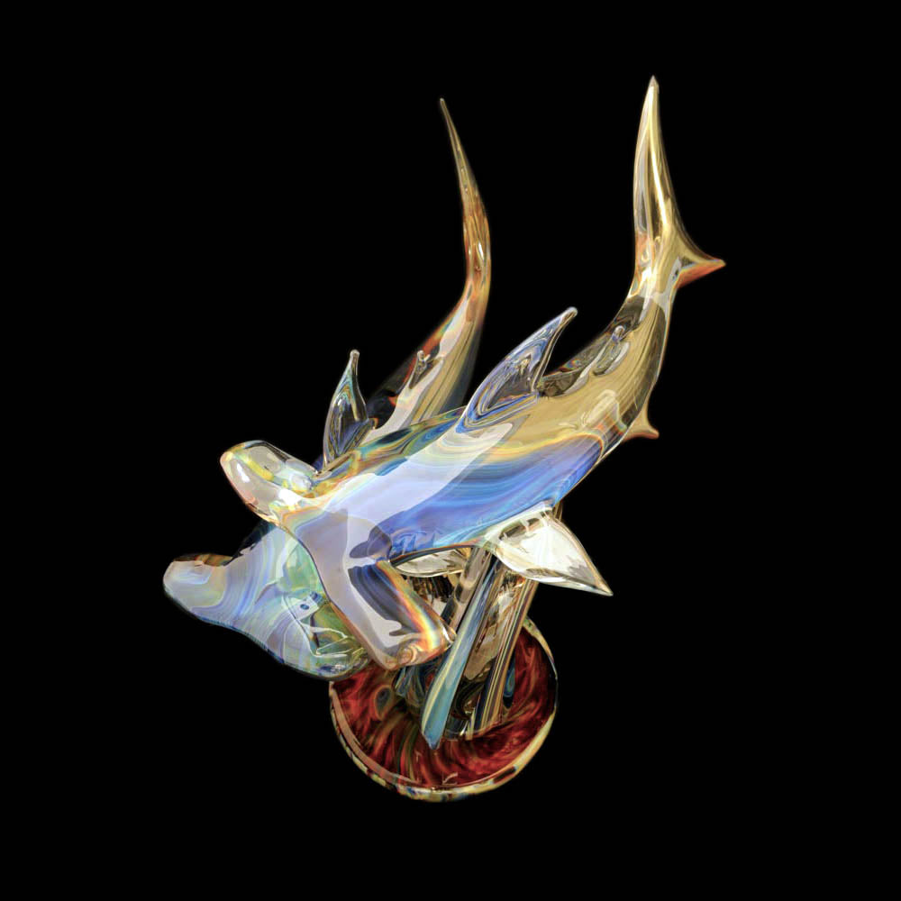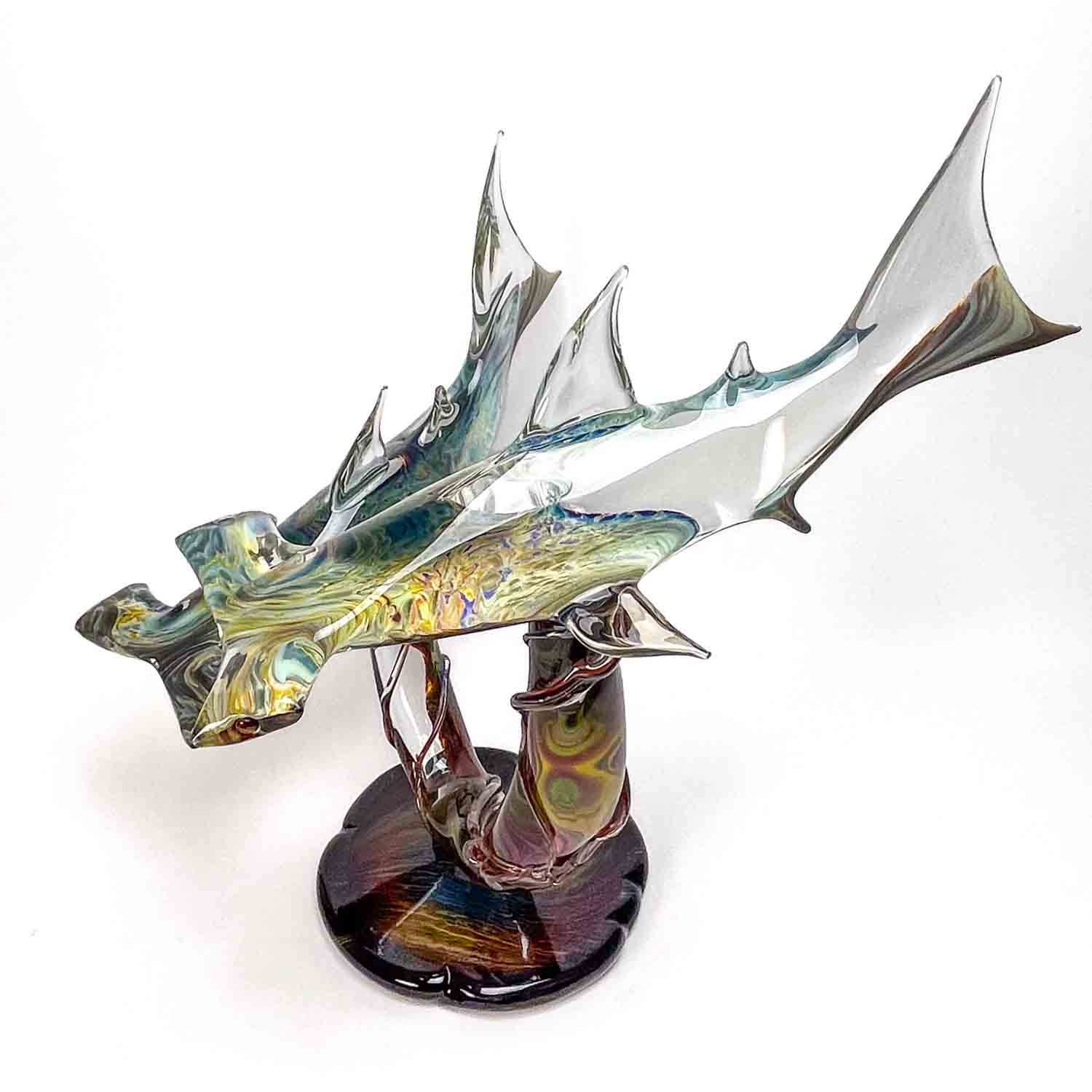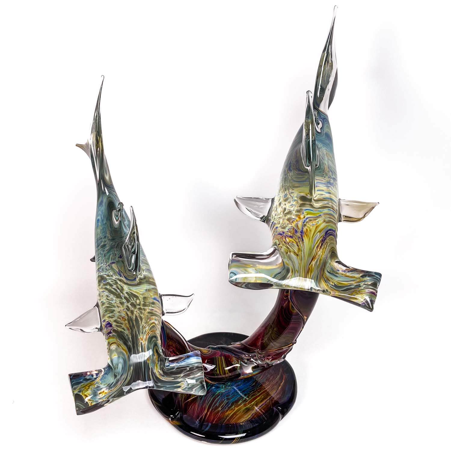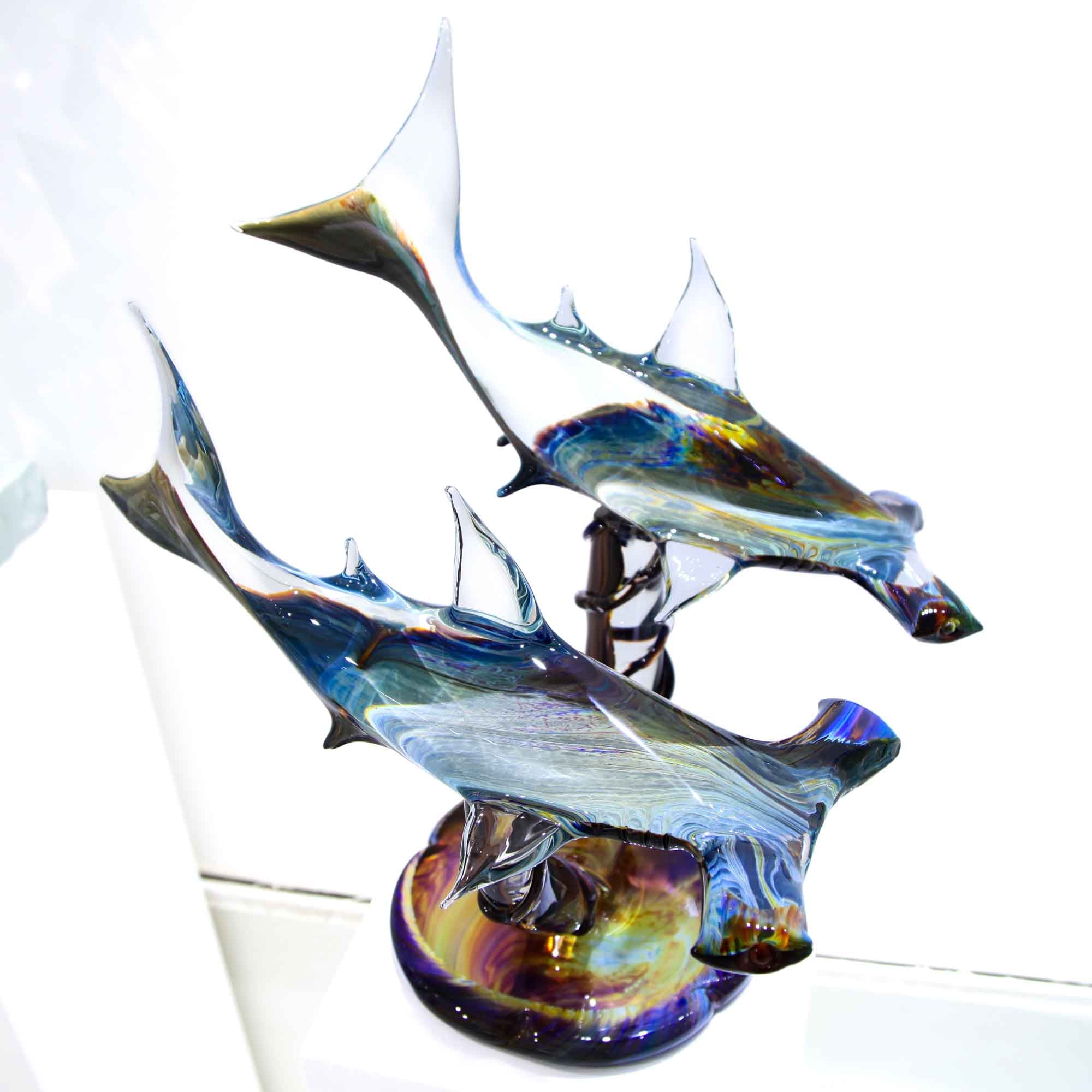 Sculpture of two Hammerhead sharks in Murano glass, made using the Massello and Calcedonio techniques.