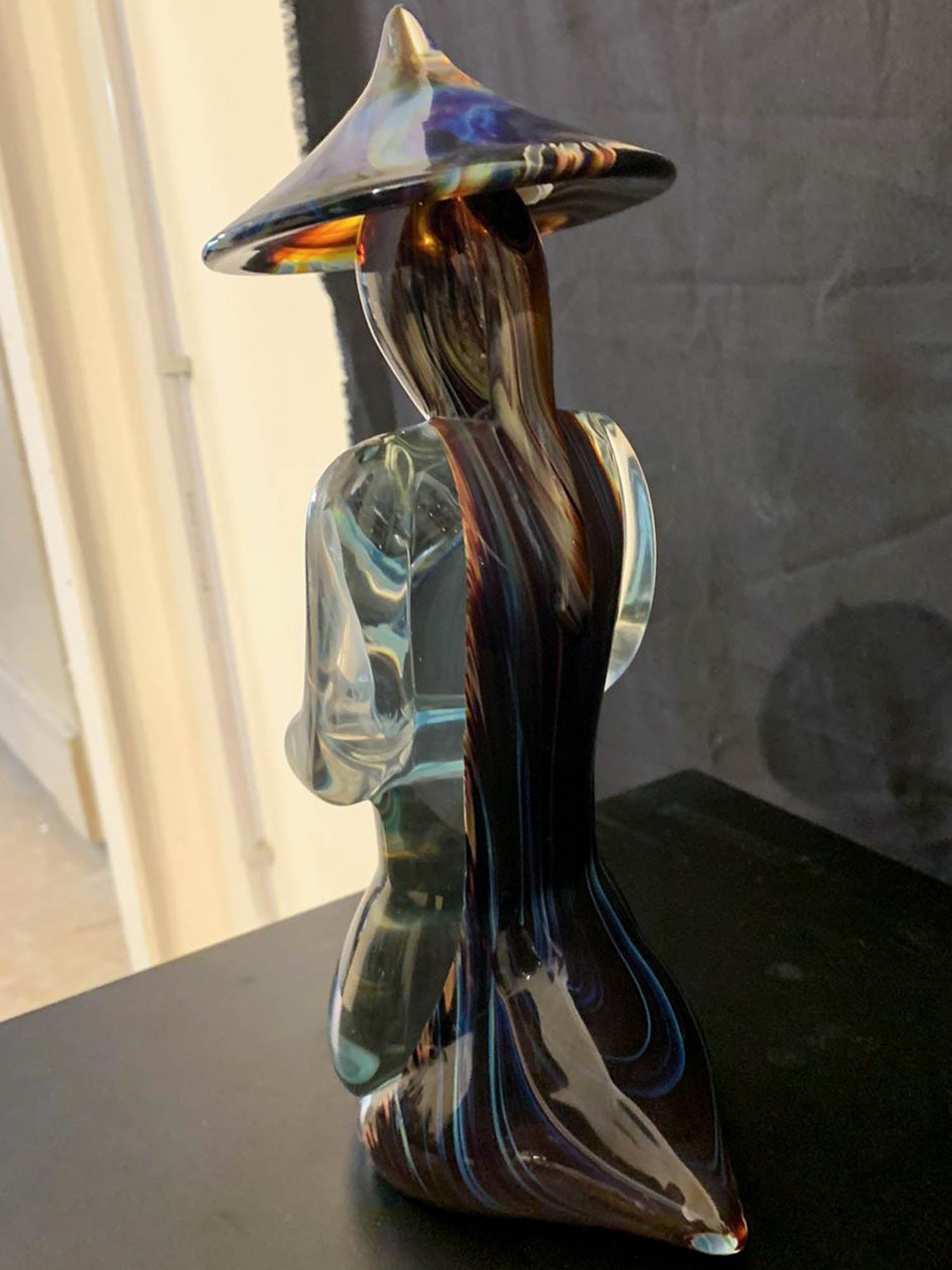 Ethnic figures are a classic theme in Murano glass production, due to the contacts that the Repulic of Venice had built with far countries, such as China. Here maestro Tagliapietra celebrates that bond with a stylized sculpture of a kneeling Chinese figure.