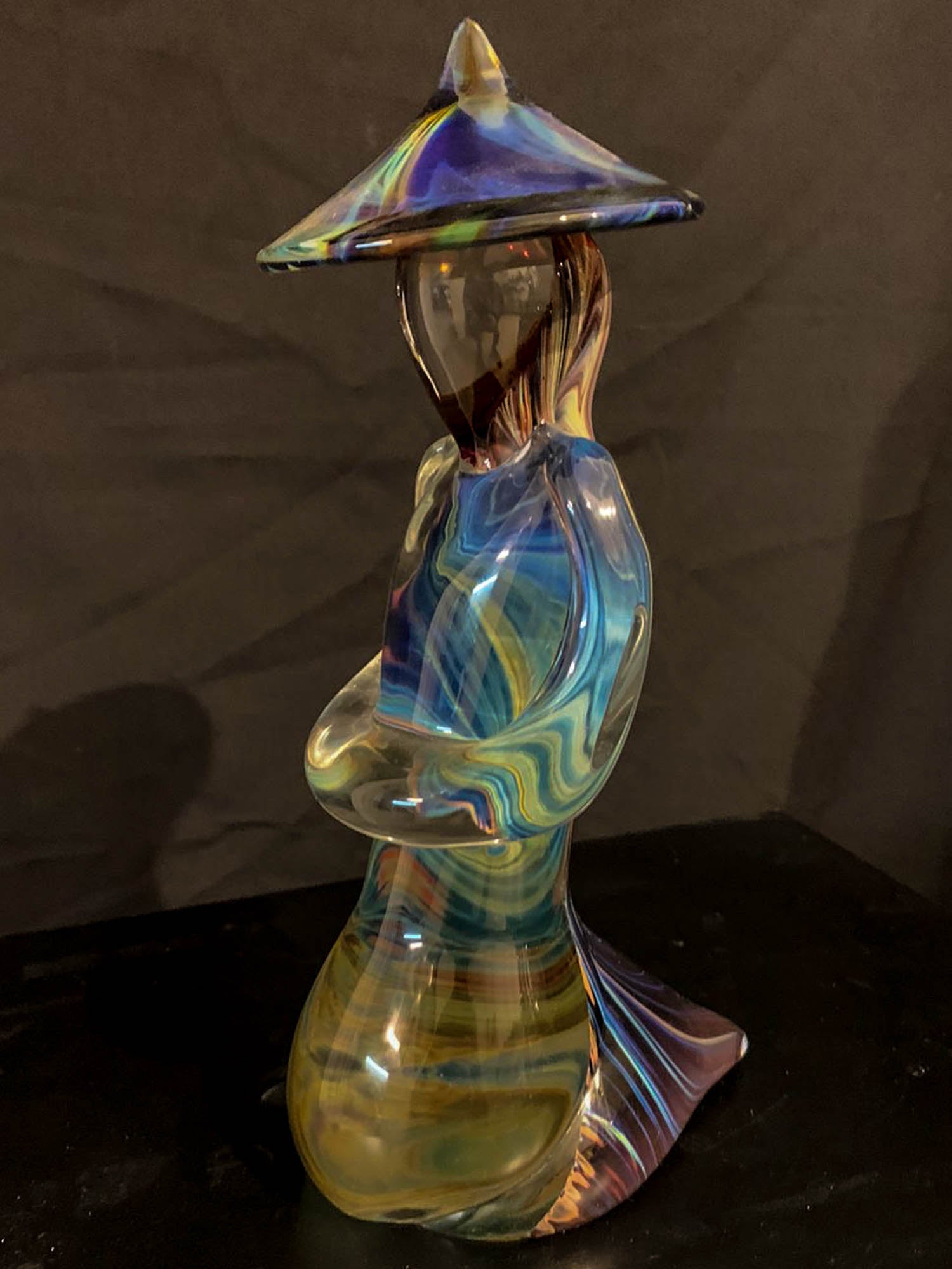 This Murano Glass figure, like all others, was handcrafted using ancient glassblowing techniques. Murano glass artists used the Massello and Calcedonio methods to create this artwork of a Chinese man kneeling.The Caledonia process is responsible for the vibrant, shimmering colours. For the colouring, a mixture of different metal oxides is added to the hot liquid glass before it cools.