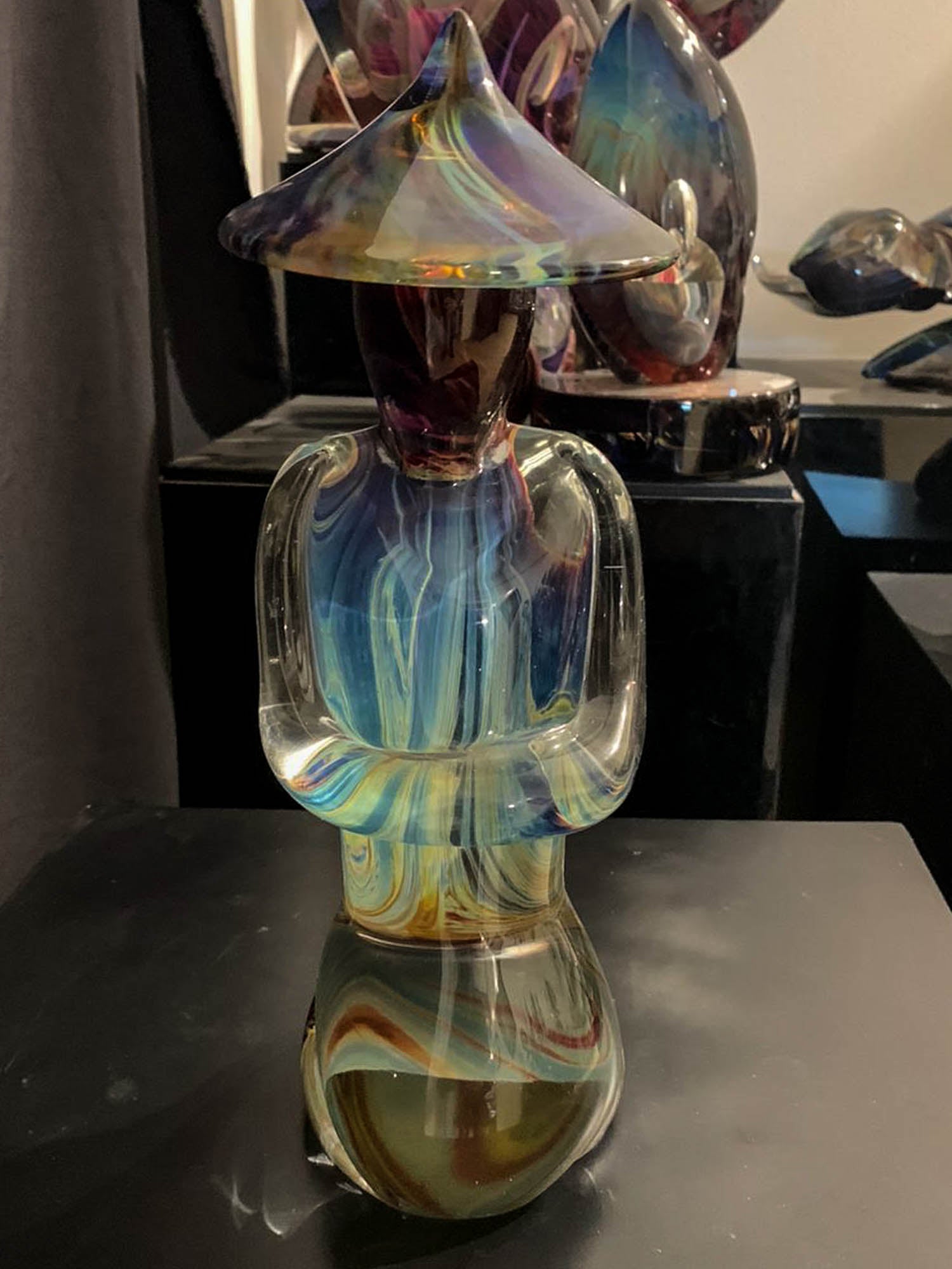 A famous subject in Murano glassmaking, ethnic characters emerged as a result of the Venetian Republic's interactions with far-flung places like China.In this instance, maestro Tagliapietra honours that connection with a stylised piece of art of a kneeling Chinese person. This Murano Glass figurine is the ideal addition to your workplace desk, whether that's at home or office.