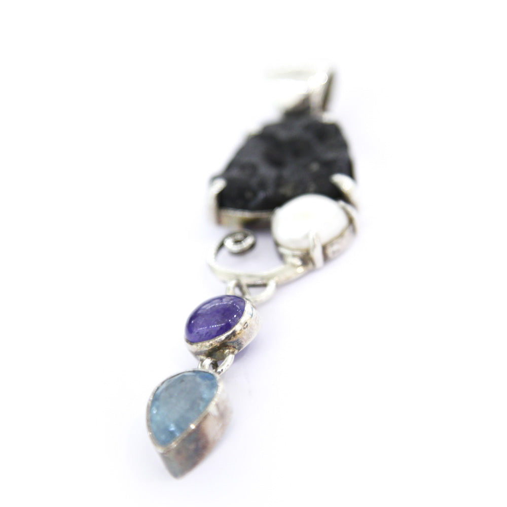 Pendant in 925 silver with Iron Fragments melted by the Etruscans, Aquamarine, Tanzanite and Freshwater Pearl. The Etruscan Pendant is part of "Storia di Mare" (Sea Stories) a collection of unique pieces inspired by whatever comes from the sea -shapes, colours, suggestions, as well as the materials themselves: pearls, shells, pieces of coral and even pebbles smoothed by the wavves- which become an integral part of the piece of jewellery itself.