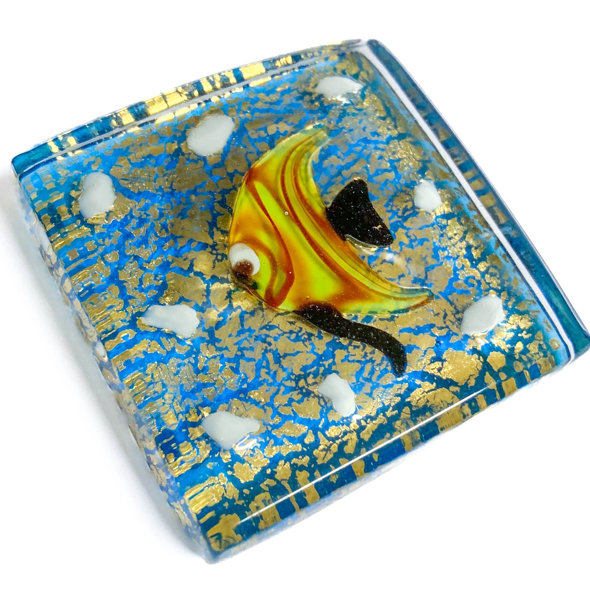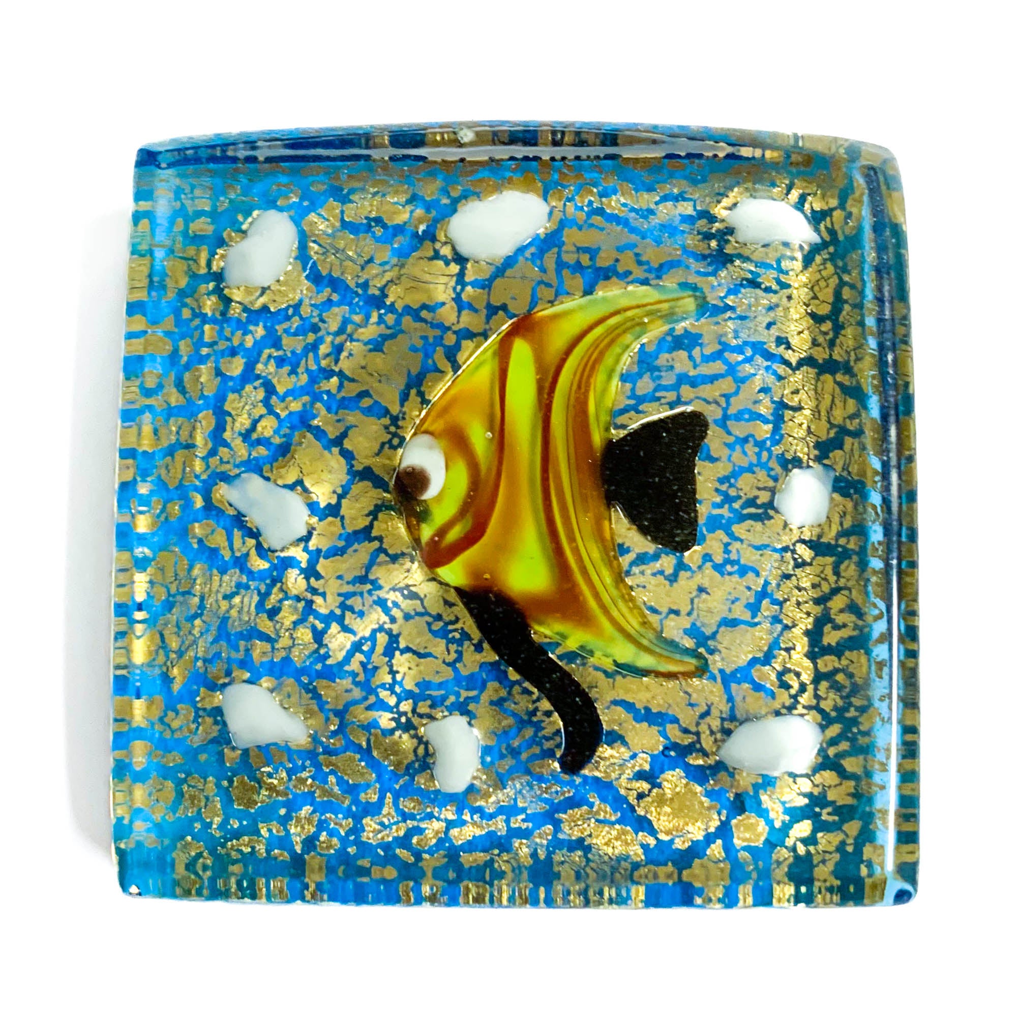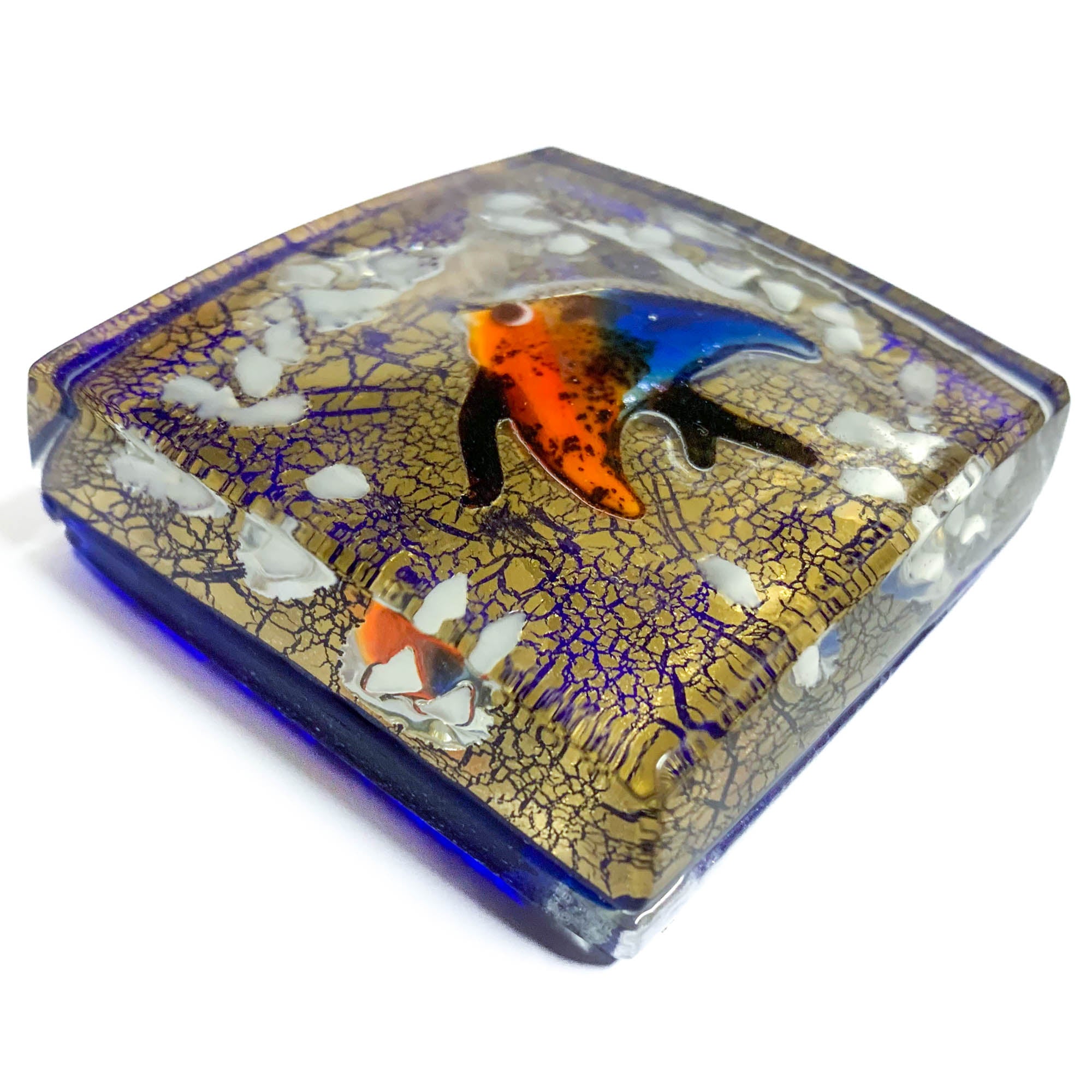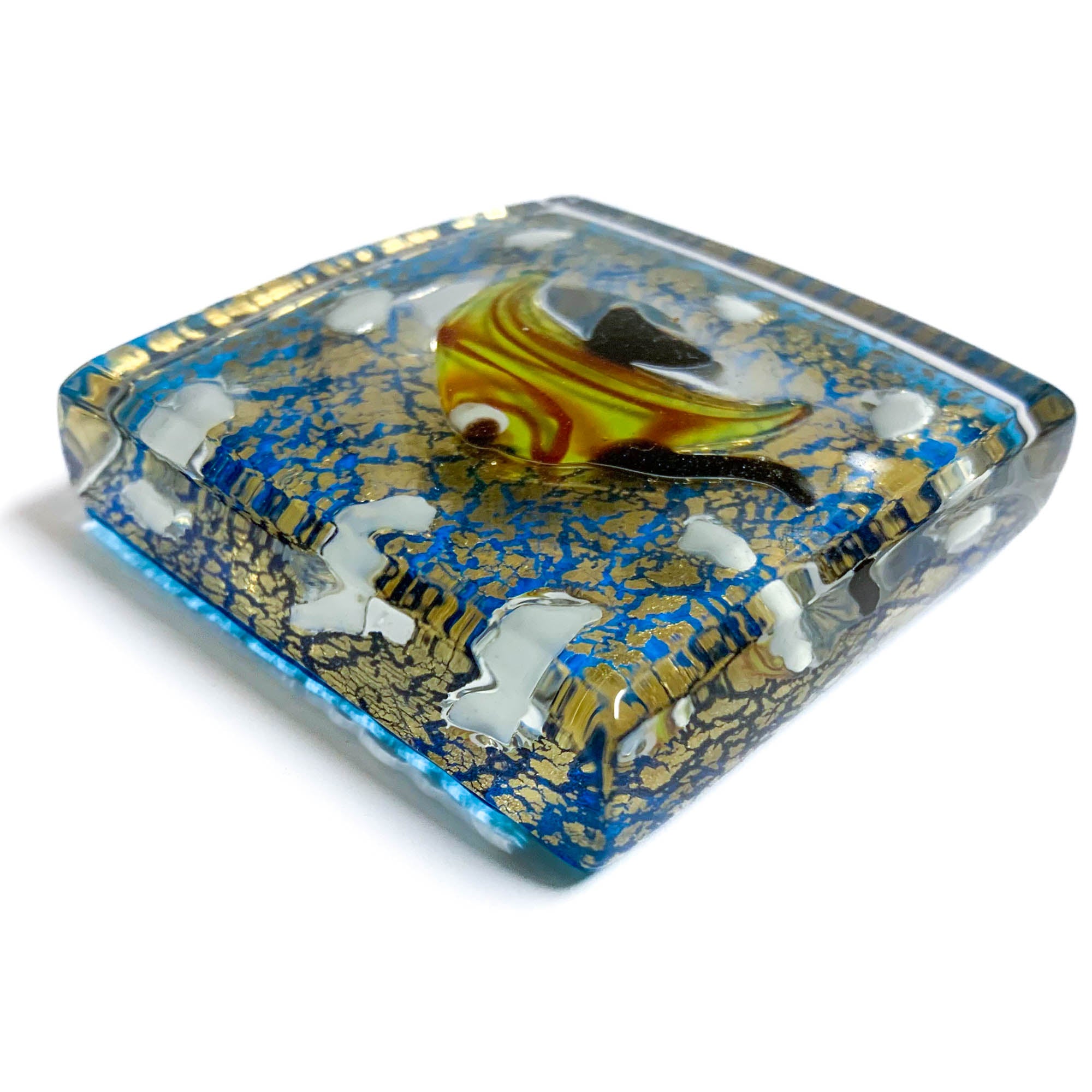 This is an elegant paperweight featured by the figure of a fish realized according to the ancient "lume" technique and fused between two glass layers. The glass includes typical venetian murrine and gold leafs