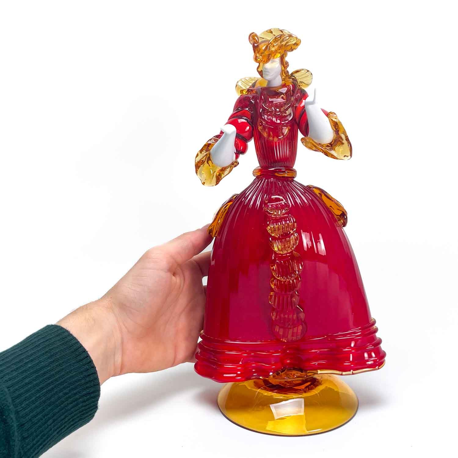 Each piece in this colored in a rich red and opaline glass, and adorned with 24kt gold leaf decorations, embodies the quintessence of the Murano glassmaking tradition. Inspired by the Baroque Venetian style of the 18th century, our Murano master glassmakers craft these statues with unmatched skill and artistic passion, resulting in a unique and incomparable glass artwork.