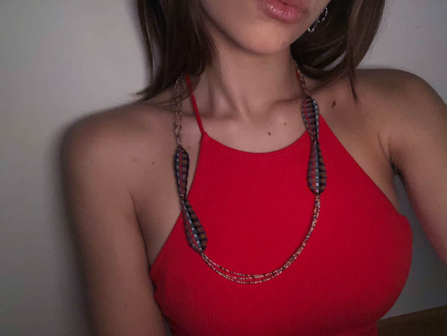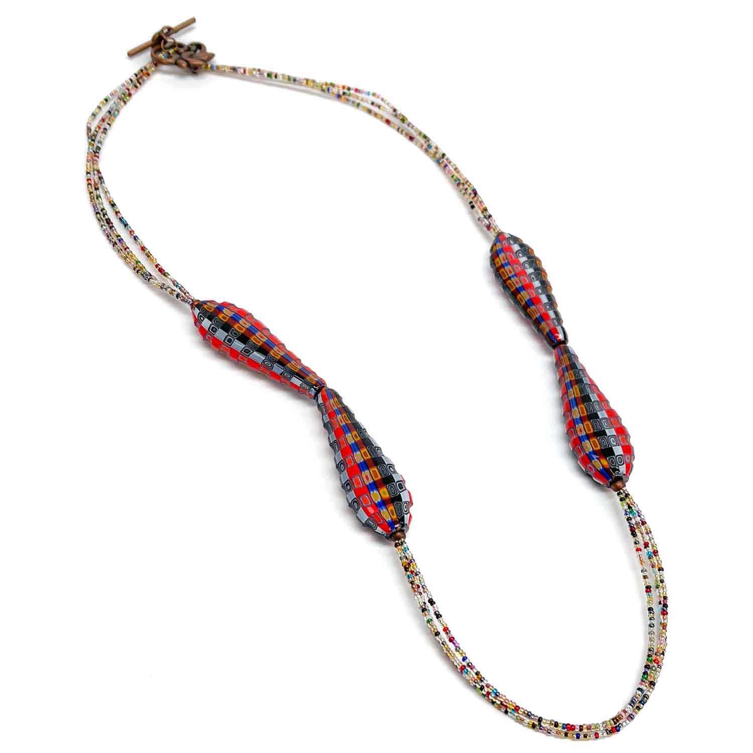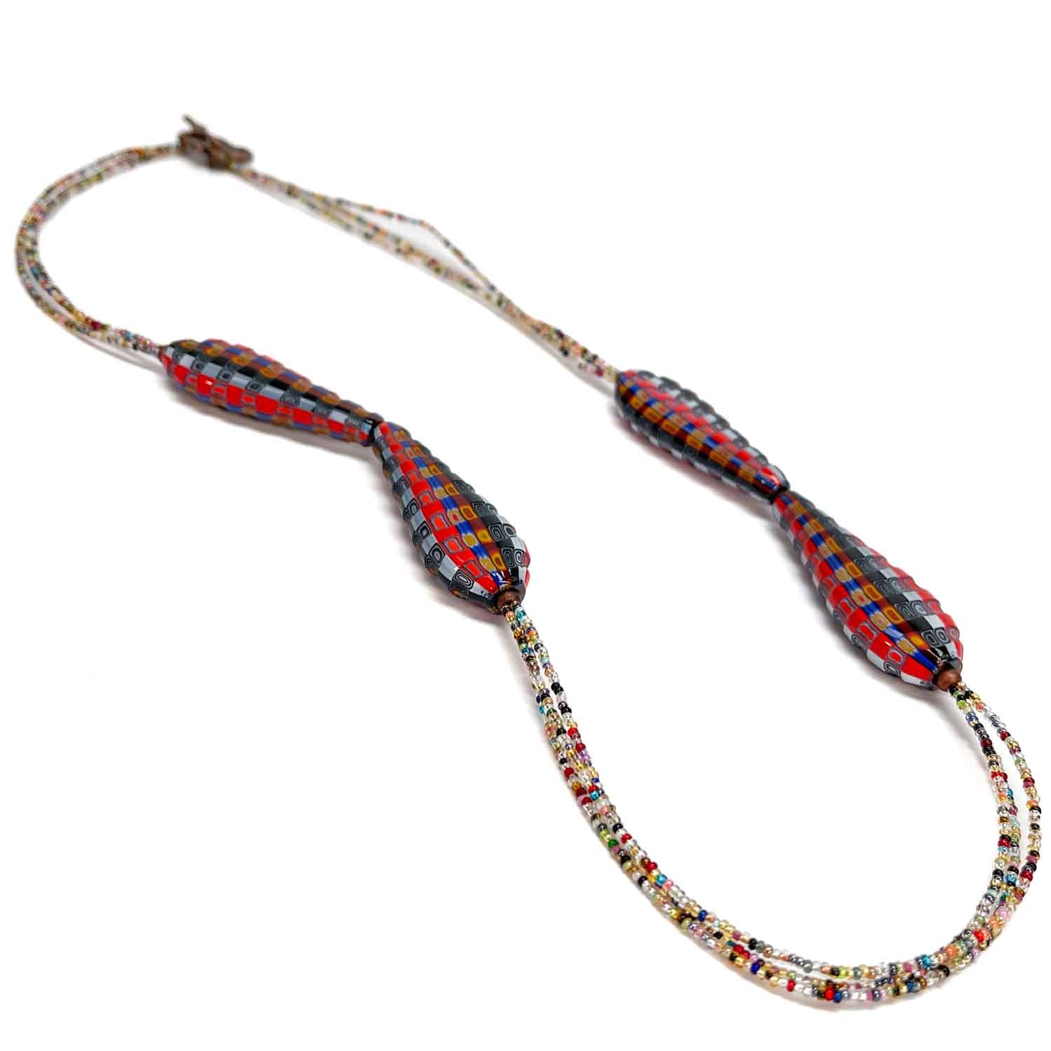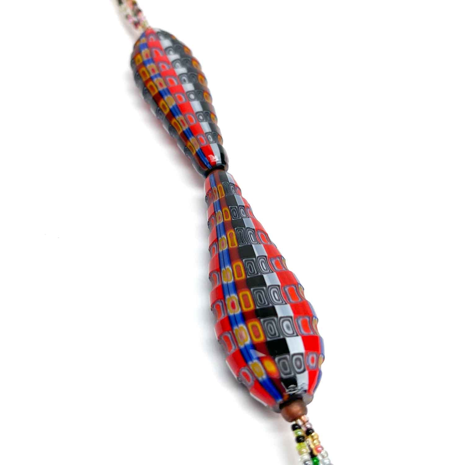 This Murano glass necklace is a stunning piece of jewelry that features four beads made with a combination of murrine and glass that has been cut with a diamond blade. The murrine is a type of decorative glass that is made by layering different colors of molten glass and then pulling it into thin sheets. The diamond blade is a specialized tool that is used to cut the glass with precision, creating intricate patterns and shapes. The result is a bead with a complex and mesmerizing design that is unique to Murano glass. The four beads are surrounded by a multitude of small, multi-colored beads, which add a touch of vibrancy and playfulness to the necklace.