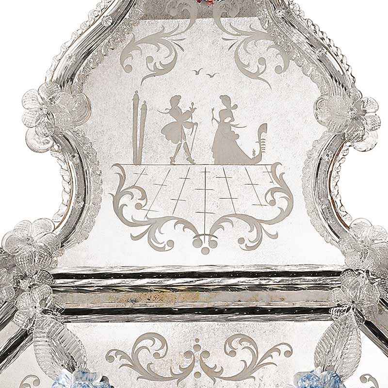 Refined Venetian mirror XVII Century hand-etched with grinding wheels and application of roses in multicolour glass-paste on massive antiqued wood backboard.