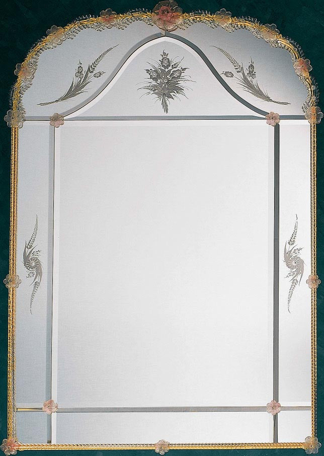 Cristal-gold and pink trims with flower etching on this reproduction of Venetian mirror.