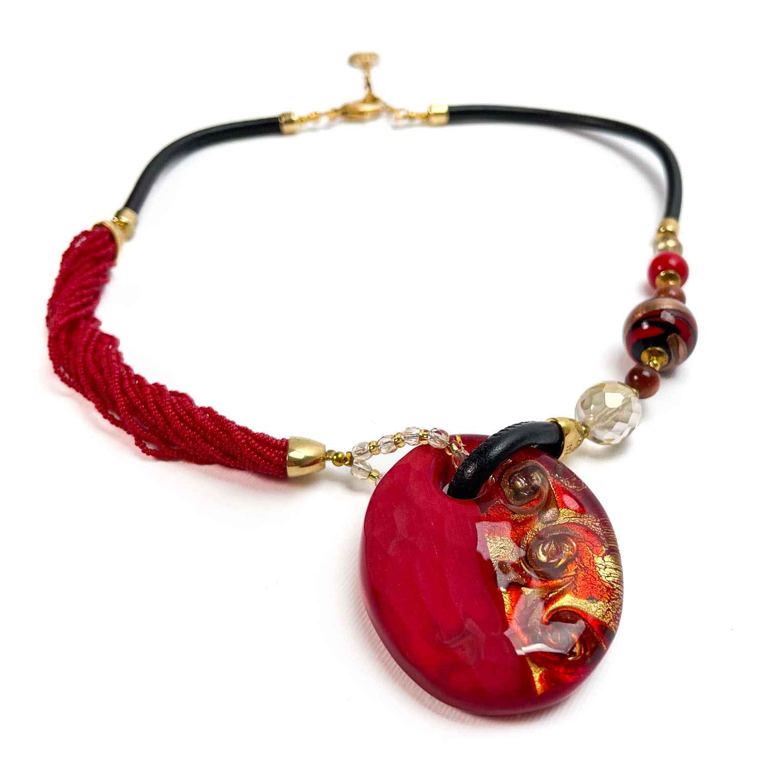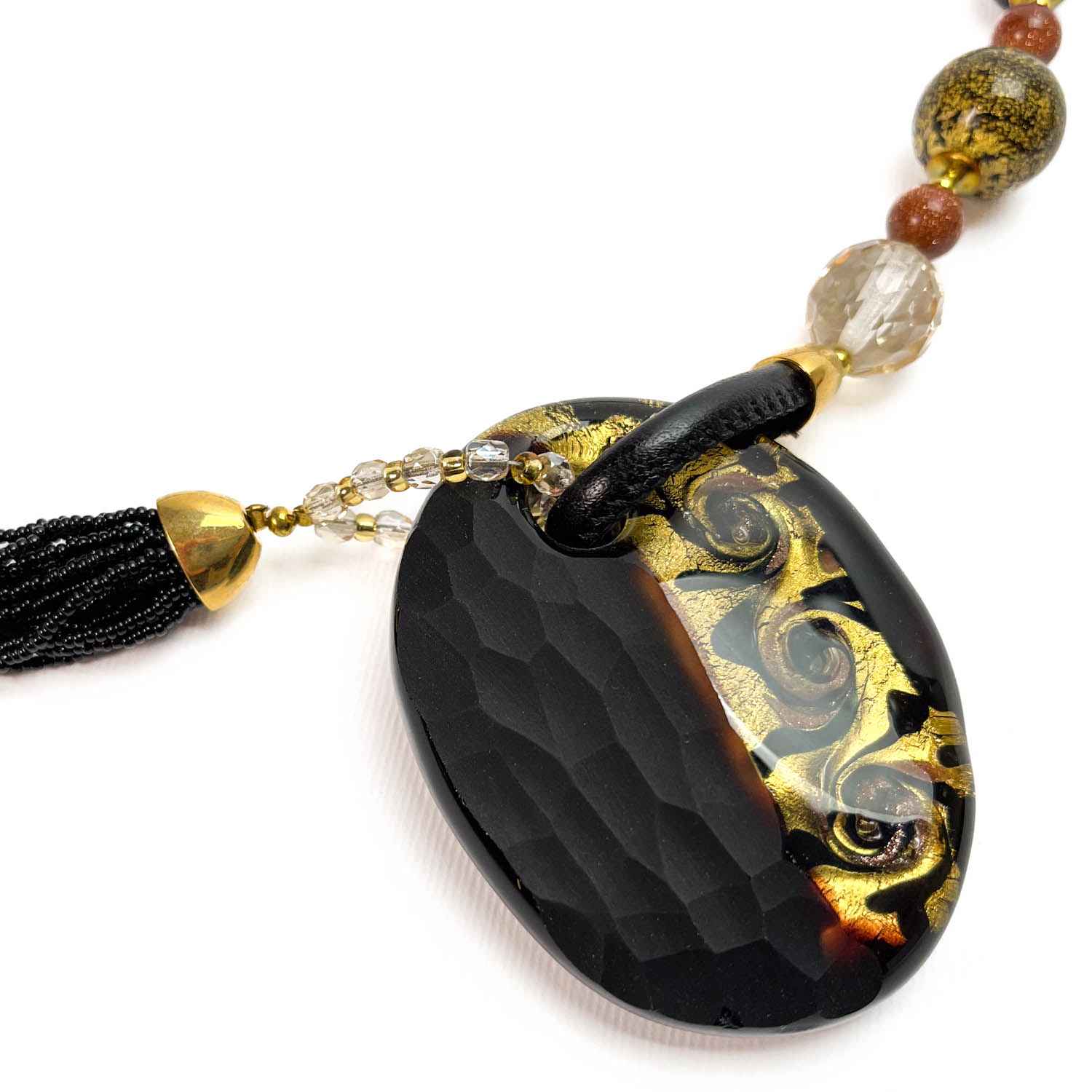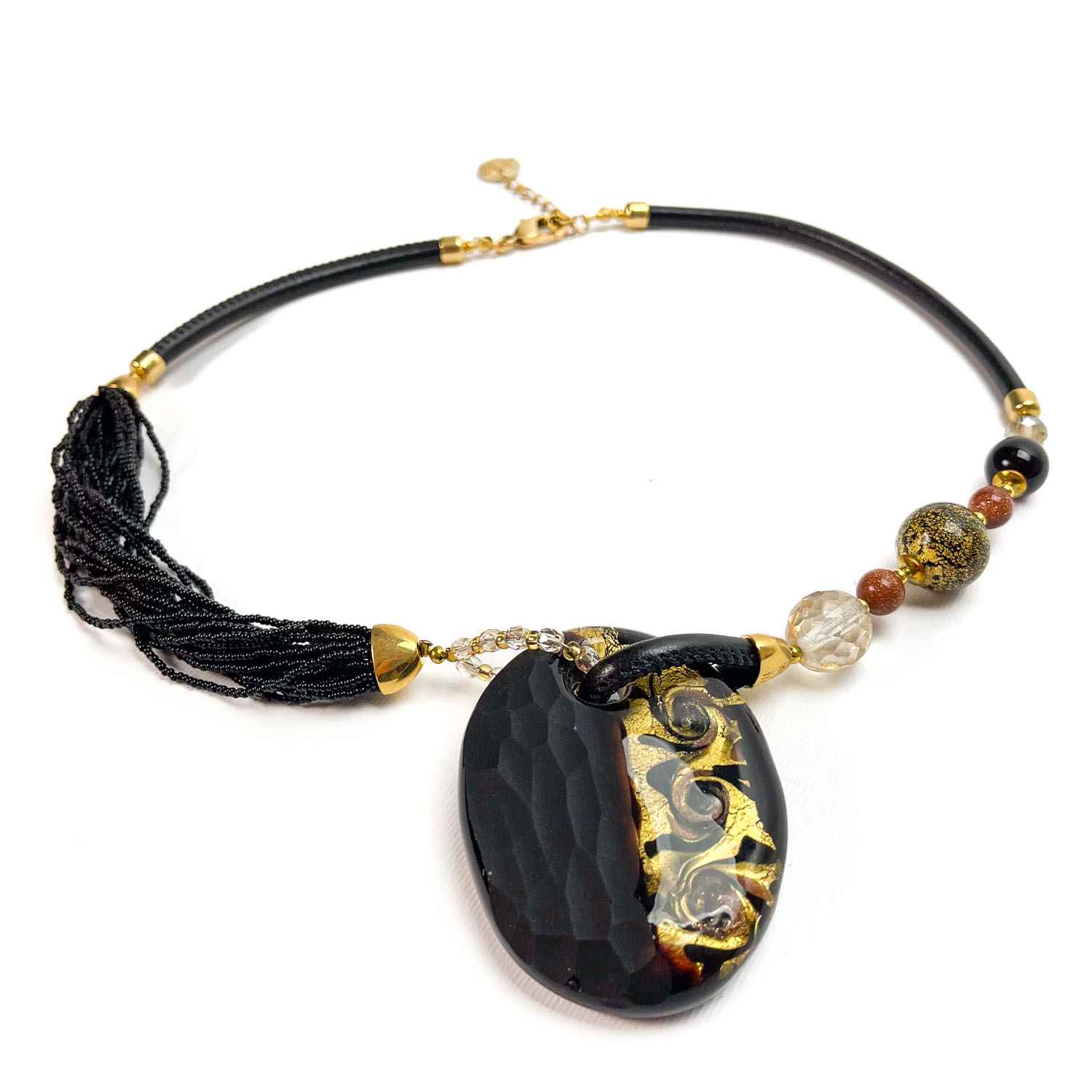 The Murano glass oval of the black one bead has been  embellished with the  battuto  technique. All of them are enriched with the avventurina and calcedonio techniques.