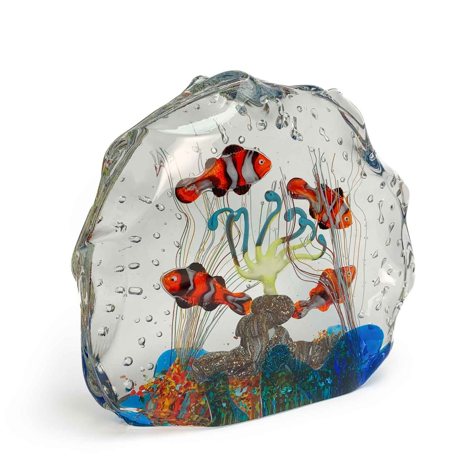 The main body is made in massello glass whereas the fishes and seaweed are prepared apart and then included in the crystal body.Read more about Murano glass Aquariums on our blog: click here
