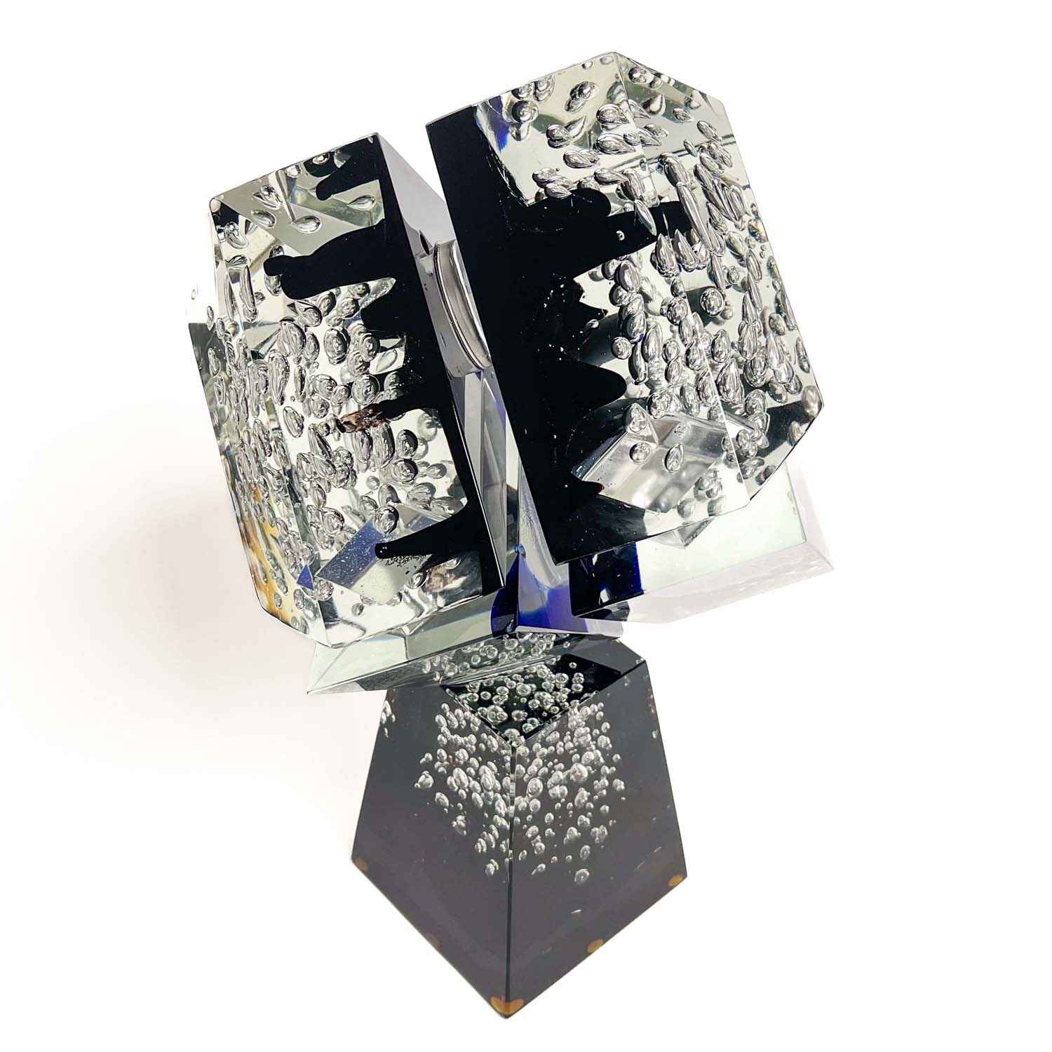 From Romano Donà an astonishing composition of two different sculptures: the base has been created with the same techniques of the overlying cube.