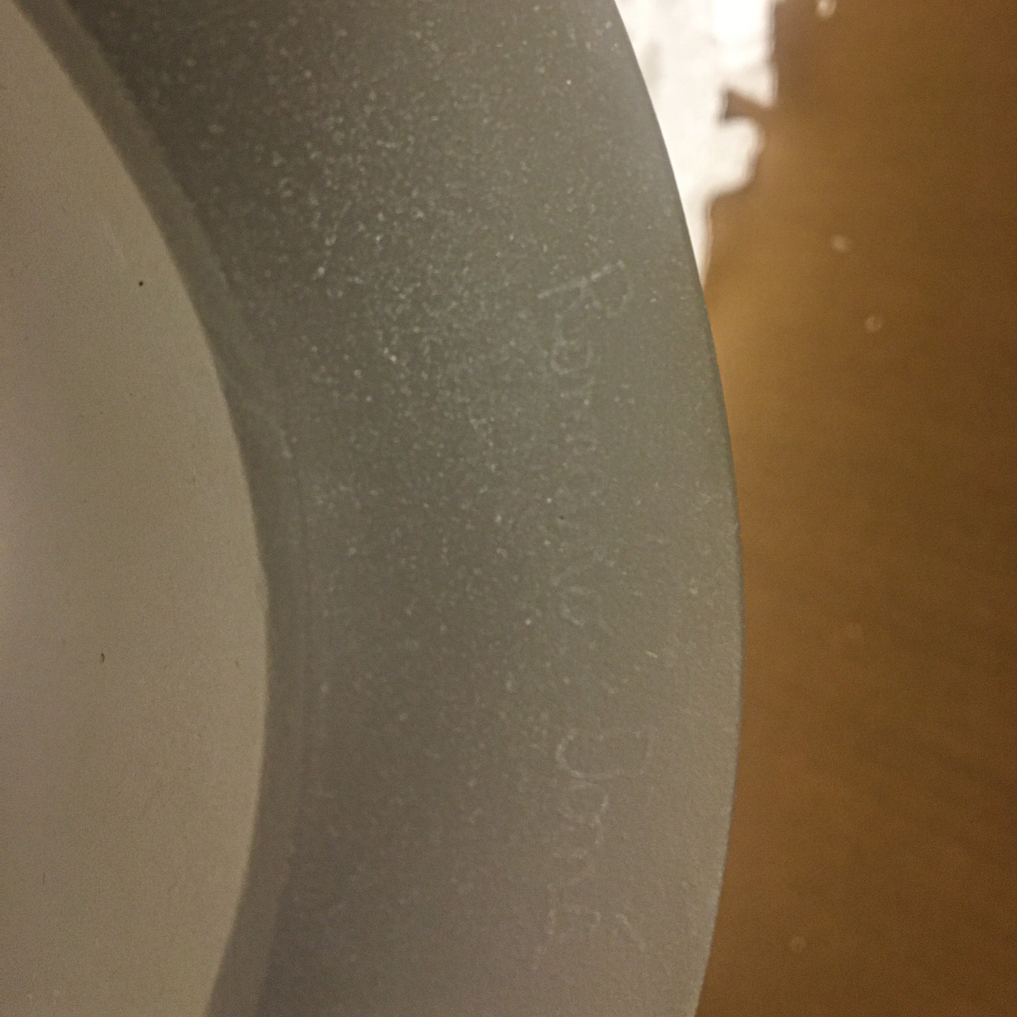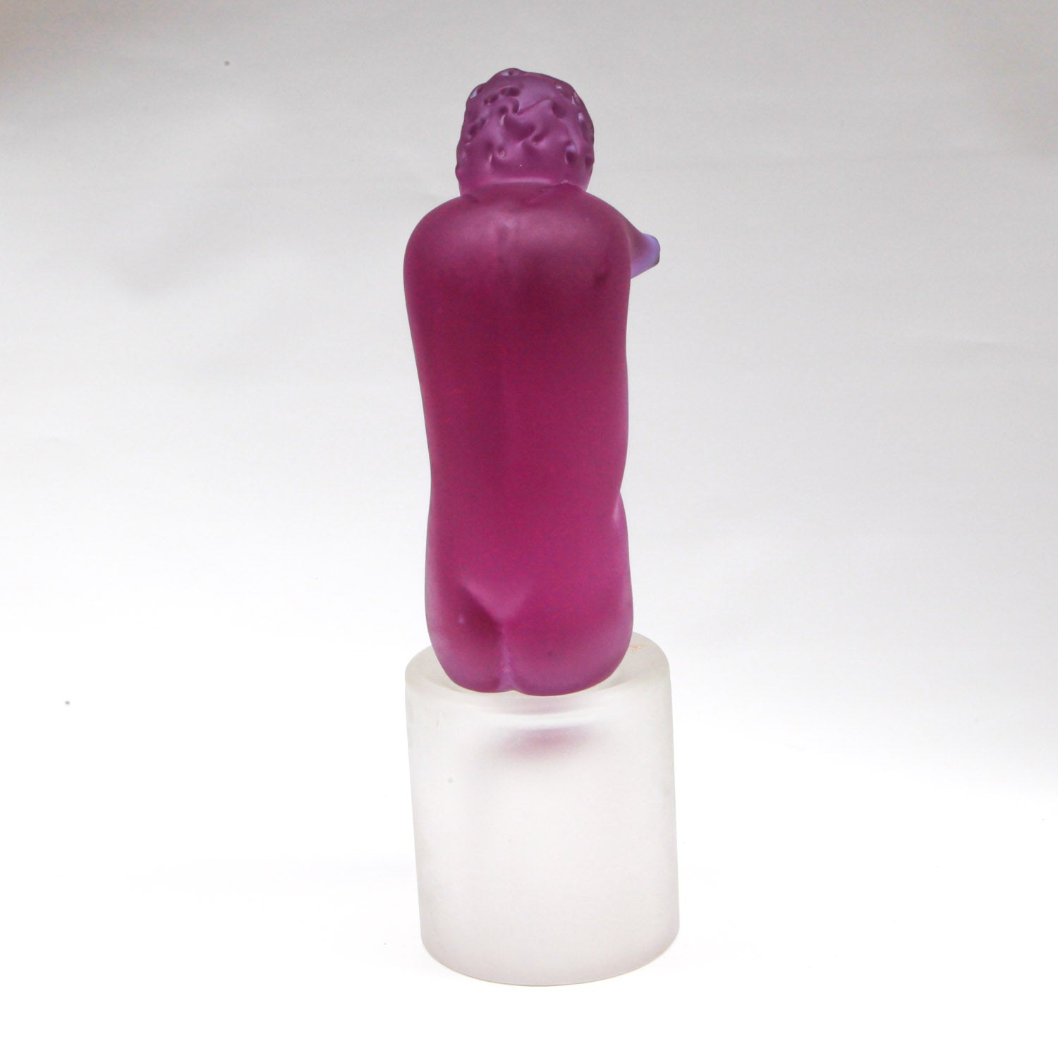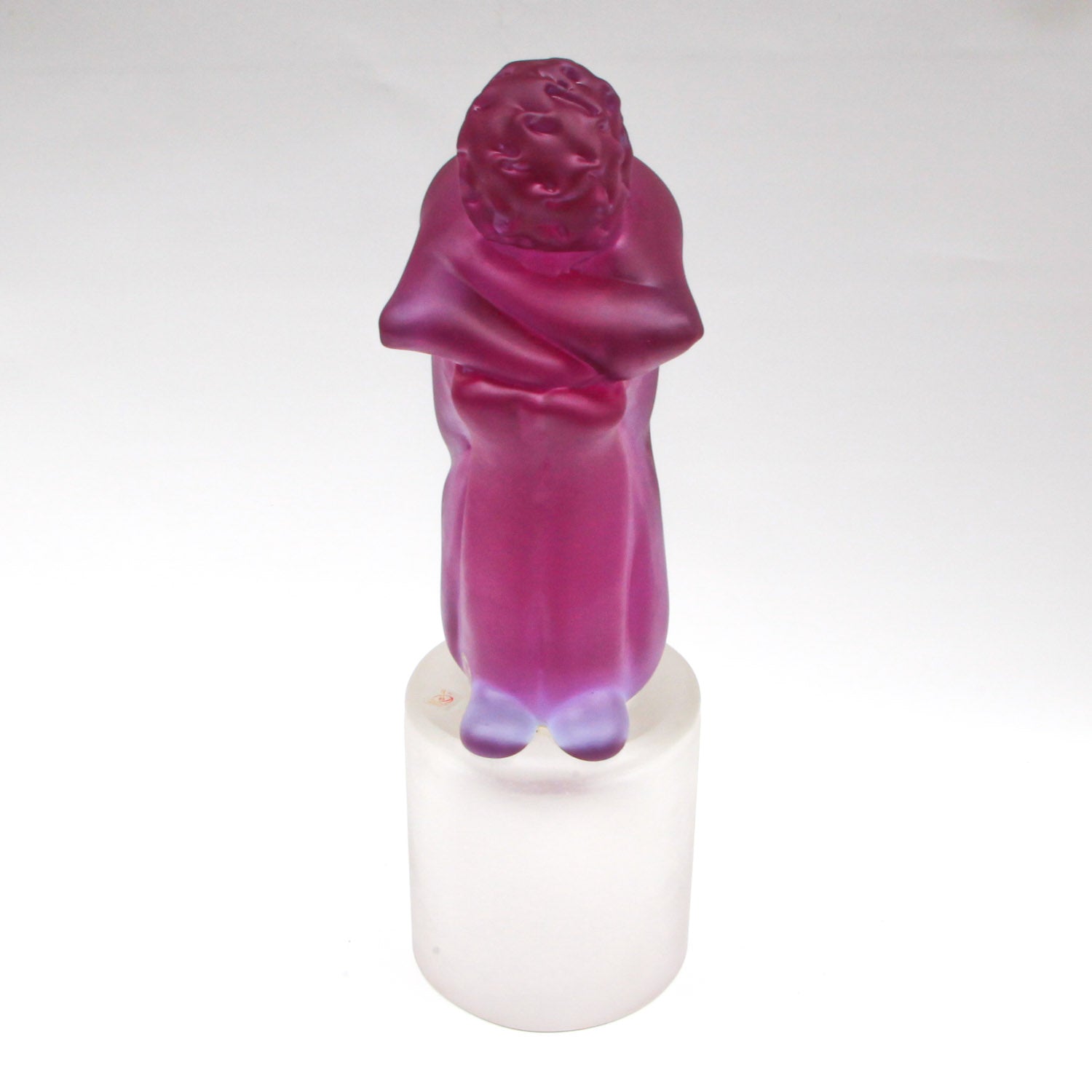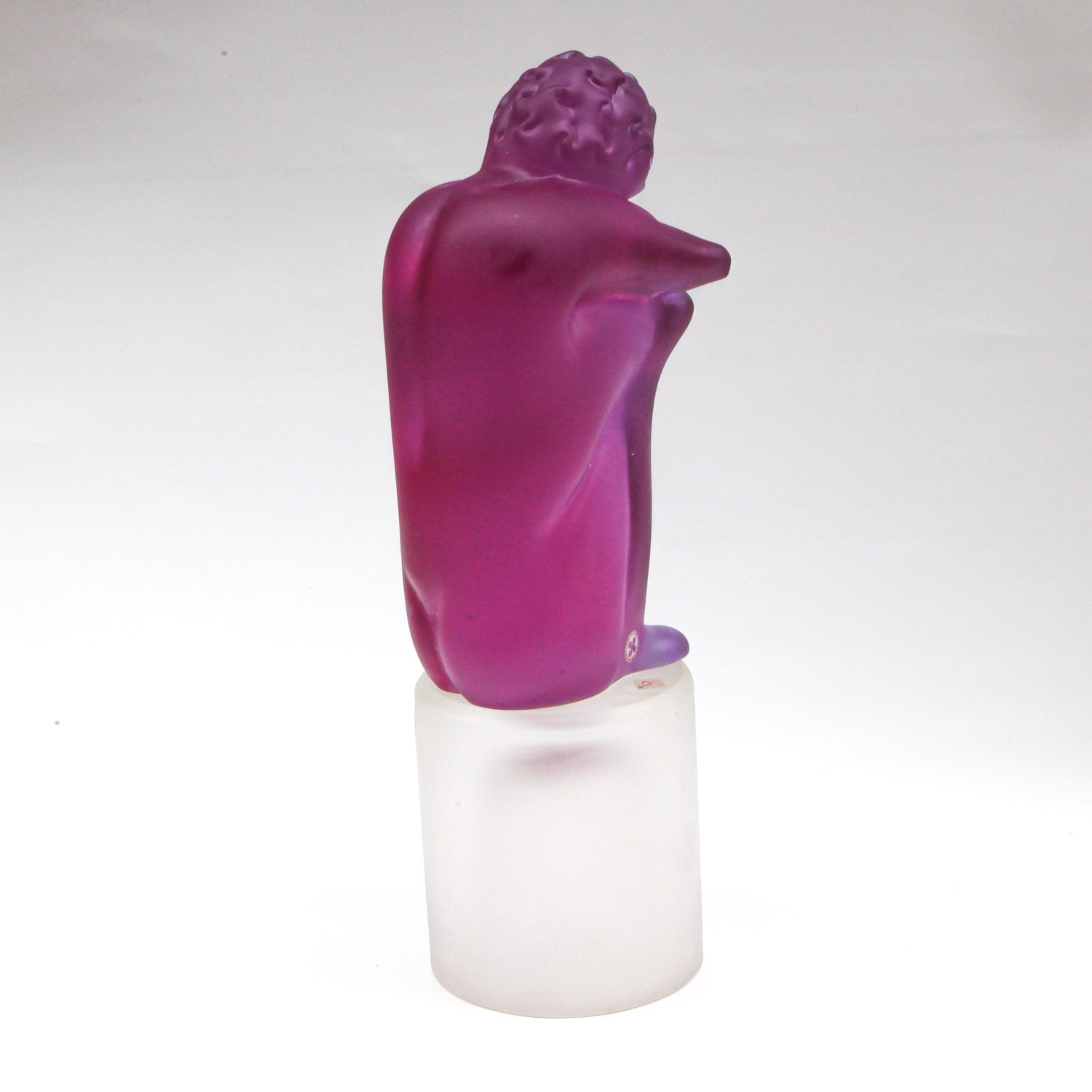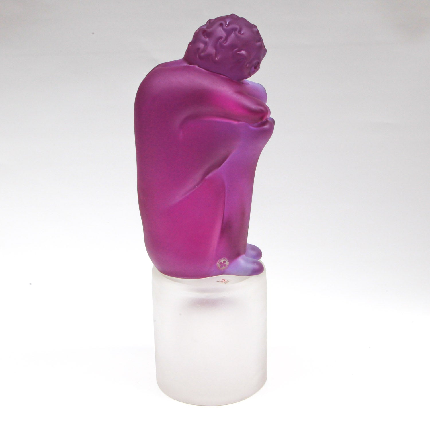 Romano leaves aside the typical transparencies of glass to rely on a uniform opaque violet glass mass in which the eye is lost in depth and then returns to the simple and essential lines.