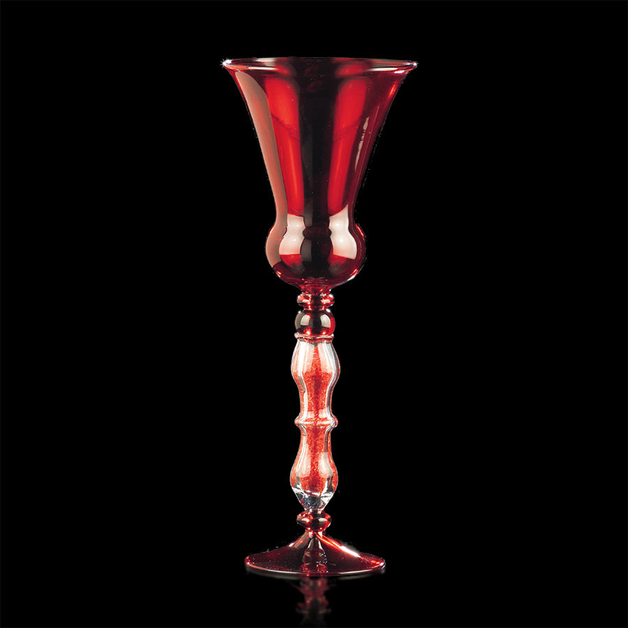 This is a large handmade Murano glass goblet with intricate details in red and crystal with golden details.