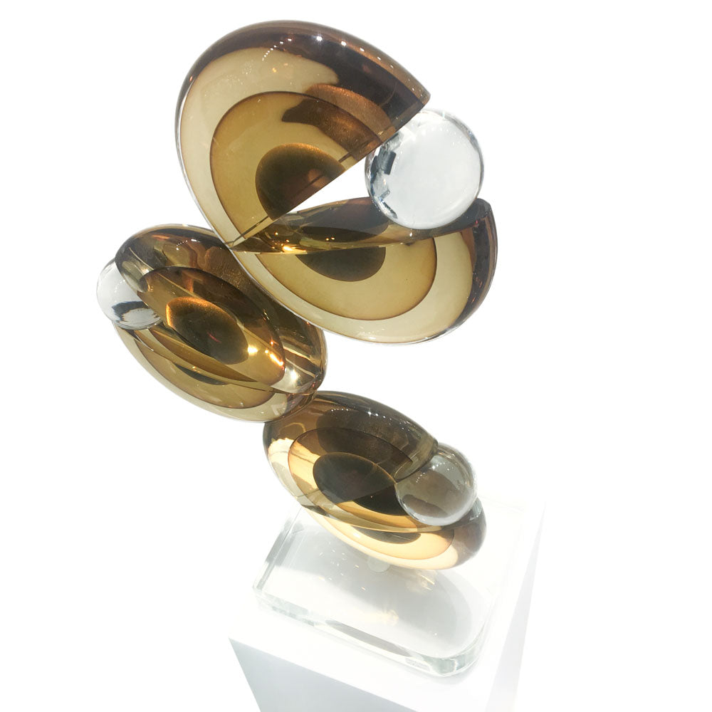 This large modern abstract sculpture is a masterpiece of authentic Murano glass art. Using the ancient technique of sbruffi, repurposed in a contemporary way, it displays the beauty of colors and transparencies typical of Murano glass . Handcrafted by master glassmaker, it is a mesmerizing spectacle of intricate details and unique abstract design. Perfect as a piece of furniture for the home or office, this sculpture adds a touch of elegance and sophistication to any modern or contemporary space. Included inside and fused into the glass is 24-Karat gold leaf.