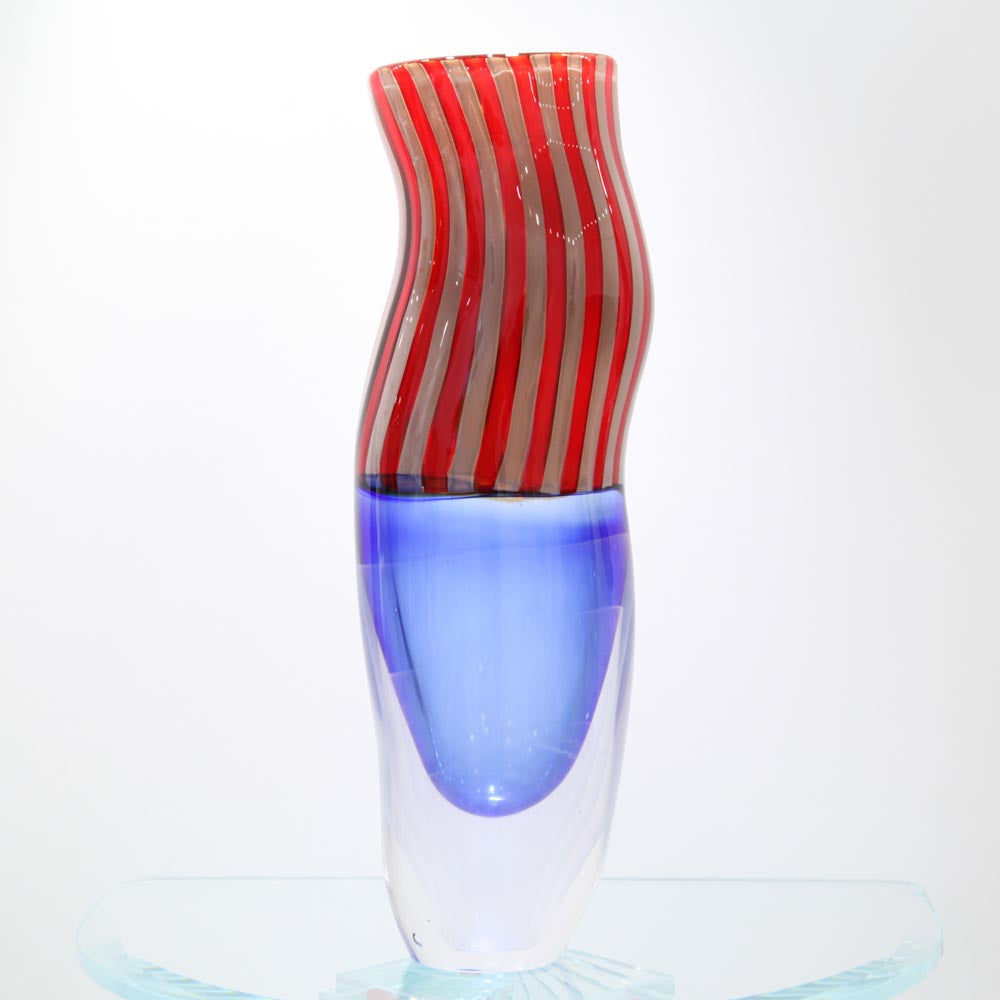 Blown Murano glass vase with incalmo. The top is blwon with sunk cannas, whereas the bottom has been made with iridescent sbruffi. This product belongs to the Sharpeye collection. Handmade by Romano Donà in Murano when he worked in Gino Cenedese's furnace, famous for the use of brilliant colours and the purity of the crystal.