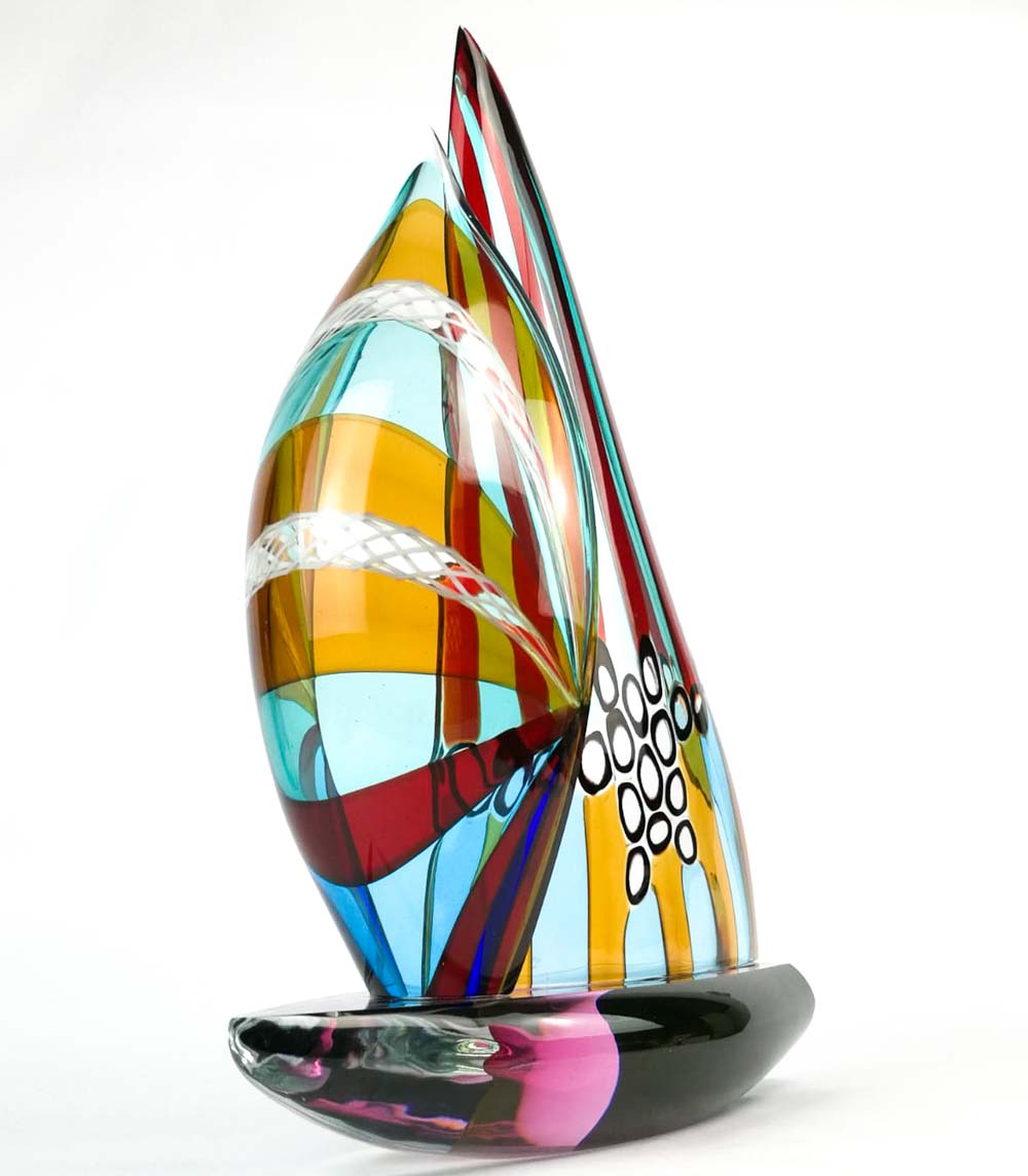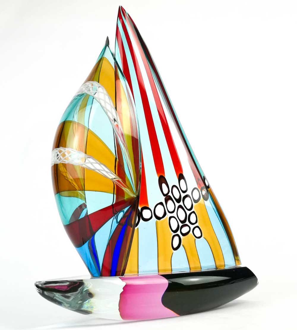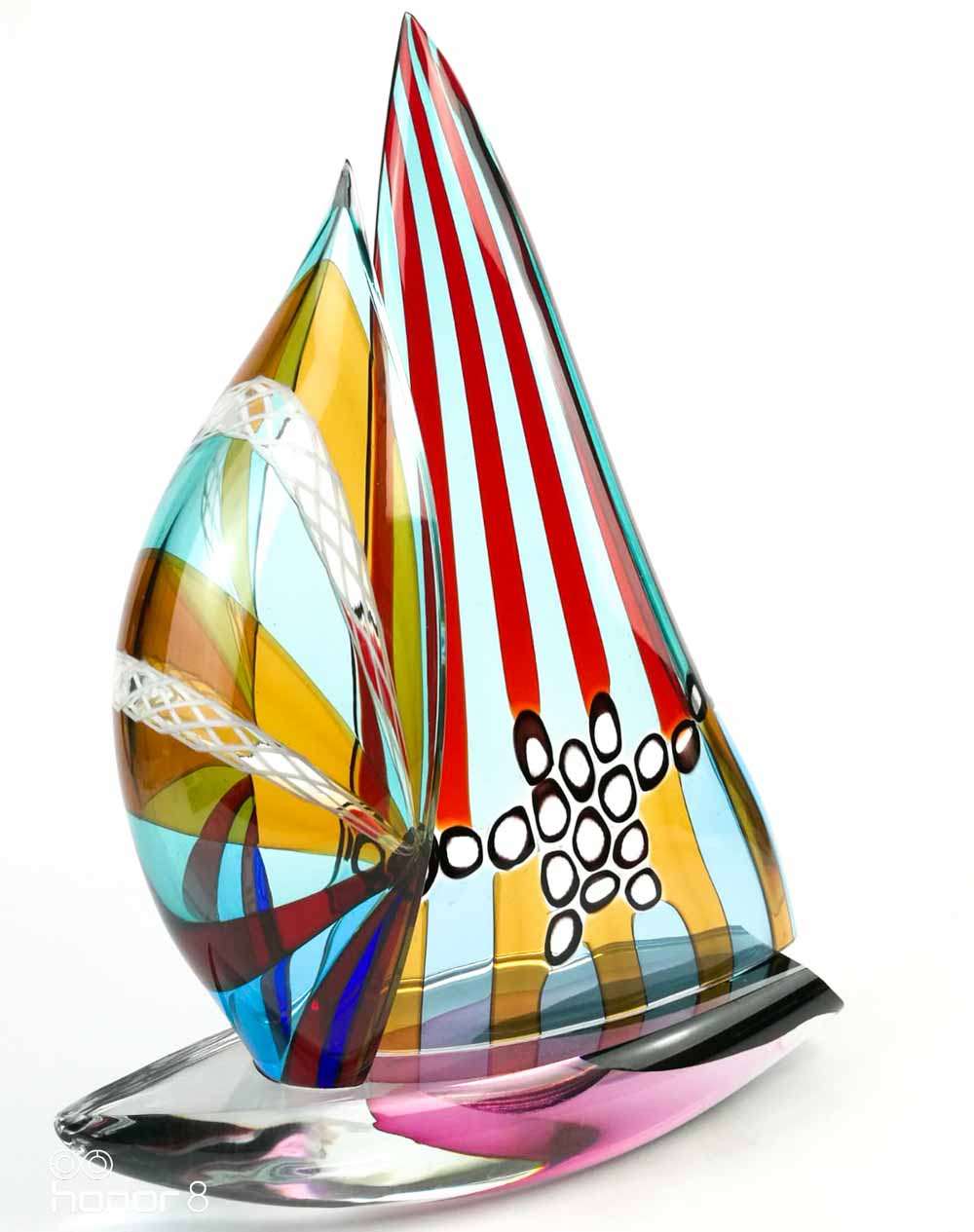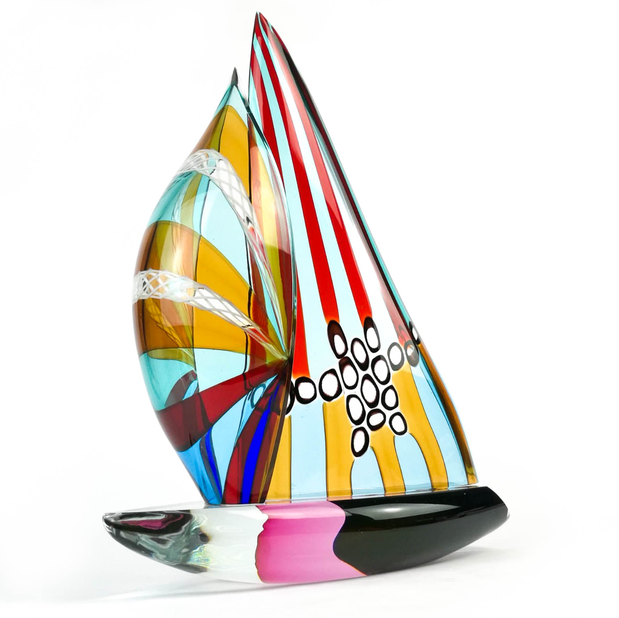 A wonderful example of Muranese art: each piece of this sailboat is handmade separately with inclusions of multicoloured canna. Its vibrant colors have been inspired by the colors of Venice and the shimmering summer light of the lagoon.Hand-made in Murano by selected artists, for our gallery; following the ancient techniques.Signed at the bottom.